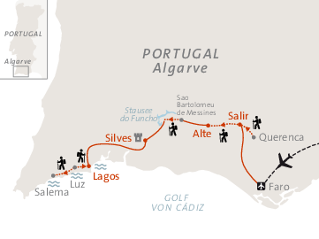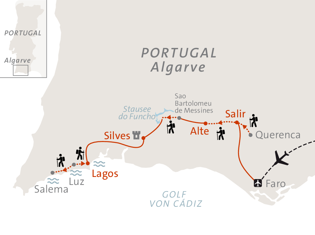 Entdecke die versteckten Schätze der Algarve auf einer individuellen Wandertour, die dich durch atemberaubende Landschaften und historische Dörfer führt. Beginne in Querença und wandere durch sanfte Hügel und duftende Flora bis nach Salir und Alte. Erlebe in Silves, einst das Zentrum der maurischen Herrschaft, einen freien Tag und genieße die charmante Altstadt mit der beeindruckenden Festung. Lass dich von der belebenden Küstenbrise auf den letzten Etappen der Tour verzaubern, während du dem malerischen Fischerpfad von Lagos nach Salema folgst. Wandere vorbei an schimmernden goldenen Stränden und beeindruckenden Klippen, die in starkem Kontrast zum ruhigen, ländlichen Hinterland der Algarve stehen. Tauche in eine Welt voller Kultur, Natur und unvergesslicher Erlebnisse ein!
