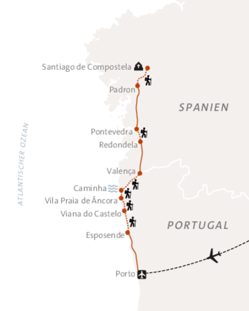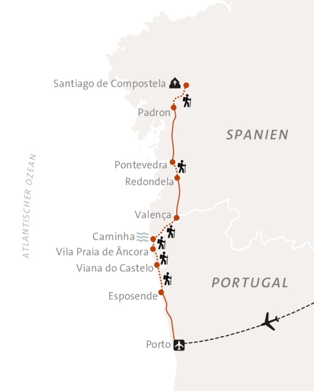 Der portugiesische Küstenweg – ein Jakobsweg mit Meerblick. Noch gilt der Caminho Português da Costa als Geheimtipp: Du wanderst von den weiten Sandstränden Portugals über Fischerorte, stille Wälder und alte Steinbrücken bis in die grünen Hügel Galiciens. Unterwegs erlebst du den Wechsel zwischen maritimem Küstenleben und historischen Altstädten – von der Festungsstadt Valença bis zu den Plätzen und Kirchen von Pontevedra. Schritt für Schritt wächst die Vorfreude, bis du schließlich die Kathedrale von Santiago de Compostela erreichst – ein bewegender Abschluss einer Reise voller Natur, Kultur und Geschichte.