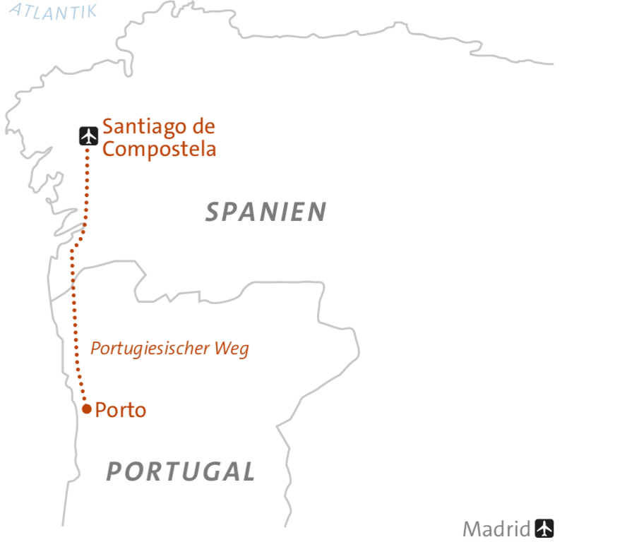 Egal ob du religiös bist oder nicht - dem Jakobsweg zu folgen ist etwas ganz Besonderes. Möglicherweise liegt es daran, dass er seit Jahrhunderten von Pilgern erwandert wird. Es ist eine Reise, die alle beeindruckt, die den Spuren der Vergangenheit folgen mit all den Herausforderungen, Höhepunkten und lebenslangen Erinnerungen. Du beginnst deine Reise in Porto und fährst rund 40-50 km pro Tag auf dem E-Bike. Auf deinem Weg nach Santiago de Compostela passierst du berühmte Orte wie Barcelos, den Fluss Cavado, Ponte de Lima oder den Rio Miño und die berühmte Grenzbrücke Ponte Internacional, die Portugal mit Spanien verbindet. Abschließender Höhepunkt der Reise ist die aus Granit erbaute Stadt Santiago de Compostela. Du besuchst die Kathedrale mit dem Grab des Apostels Jakobus, ein Ort voller Geschichte, Demut und Hoffnung.