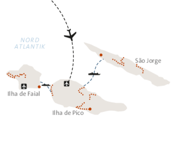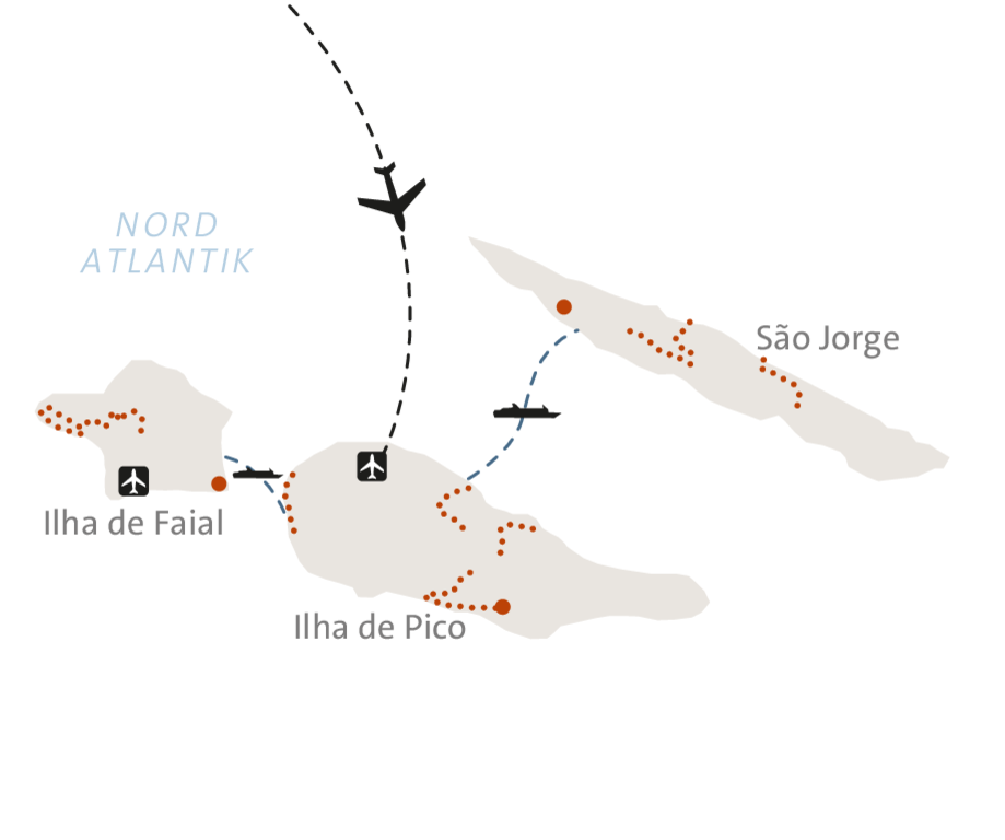 Pico, São Jorge und Faial bilden das Azorendreieck wegen ihrer Nähe zueinander und die ganzjährige Bootsverbindung. Der höchste Berg Portugals auf Pico beobachtet Sie die ganze Zeit auf Ihrer Reise. Auf São Jorge genießen Sie die Schönheit und den Frieden ihrer Fajãs und auf Faial erwarten Sie die Caldera im Herzen der Insel und der jüngste Vulkan der Azoren: Capelinhos. Ein 10-Tages Wanderprogramm, welches Ihnen eine allgemeine Idee verschafft von der Varietät der Landschaften und Kultur der zentralen Inseln des sogenannten Hawaii des Atlantiks.
