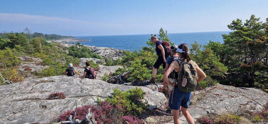<Heute wanderst du Utö Runt, eine 15 km lange Schleife im nördlichen Teil der Insel. Es ist eine abwechslungsreiche und gut markierte Wanderung mit wunderschönen Klippen, Sandstränden und ständigem Blick auf das Wasser.