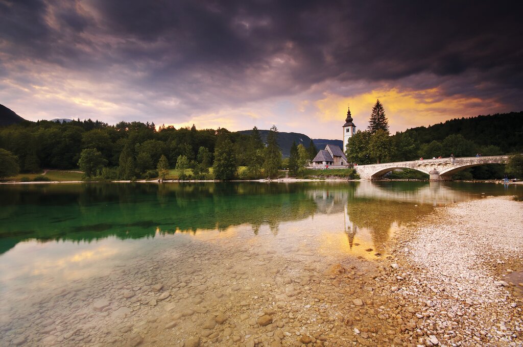 <Die Etappe führt durch die Wälder und über die Almen von Pokljuka, dann bergab zu den Dörfern Gorjuše und Koprivnik und von dort nach Jereka im Oberen Bohinjer Tal. Dort gehen Sie durch die Dörfer Češnjica, Srednja vas und Studor nach Stara Fužina.