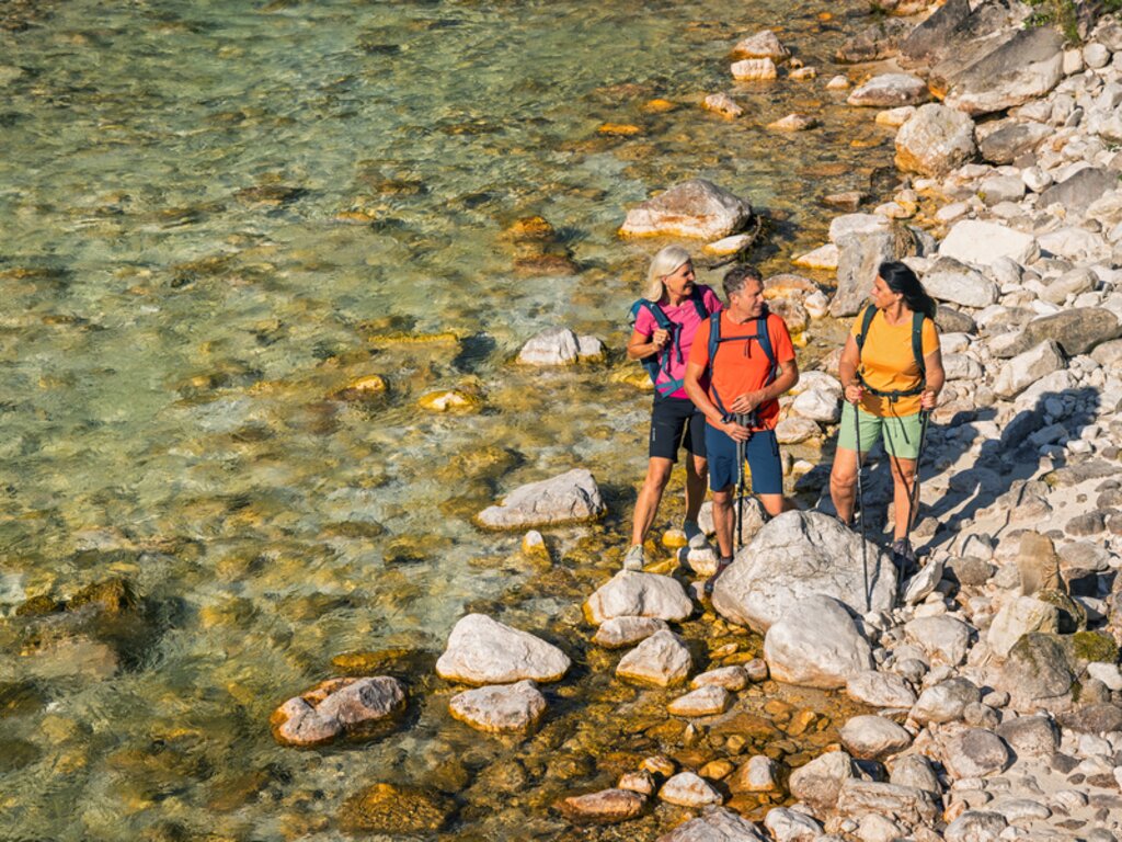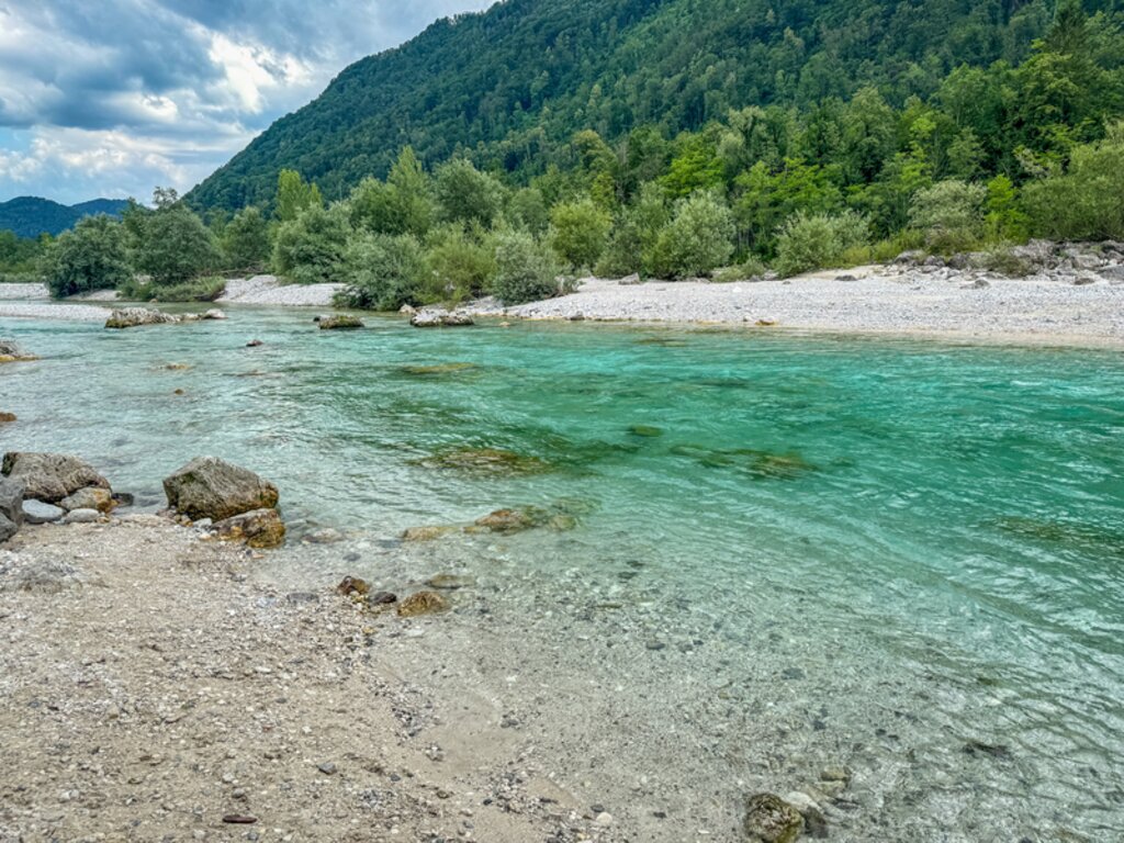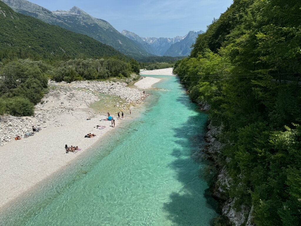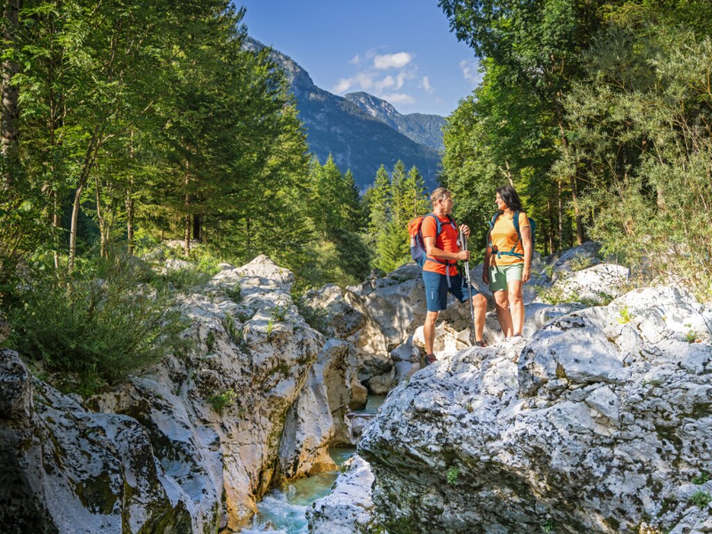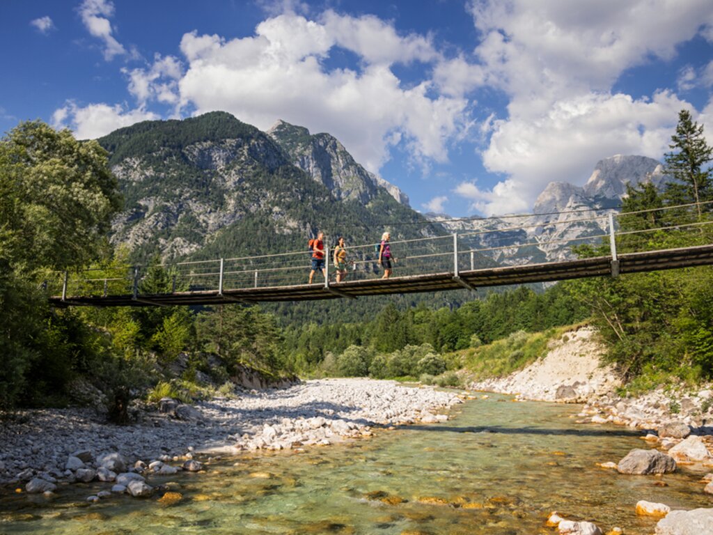 <Auf der sogenannten Königsetappe im Soča-Tal überqueren Sie mehrere Hängebrücken, die Ihnen spektakuläre Ausblicke auf den glitzernden Fluss bieten. Entlang des Weges begegnen Ihnen die beeindruckenden Soča-Tröge, natürliche Becken, die vom Fluss im Fels geformt wurden und zum Staunen einladen. Besonders an heißen Sommertagen ist das Eintauchen in die kühlen Fluten der Soča ein echtes Highlight. Bovec, das Ziel Ihrer Wanderung, ist ein bekannter Ort für Outdoorbegeisterte.