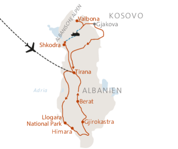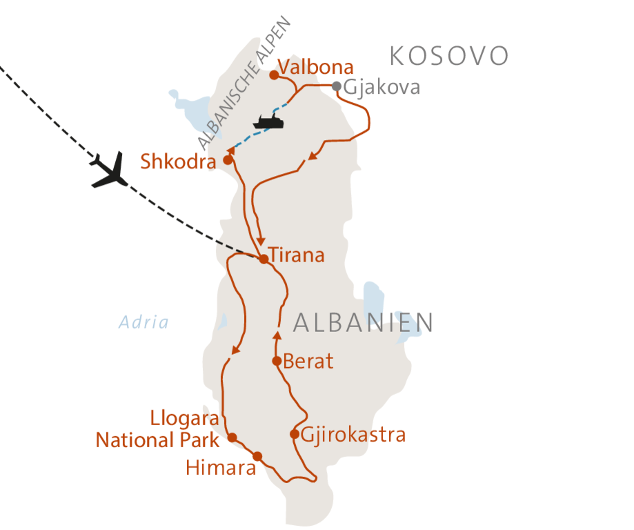 <Wir kommen in Albanien an und werden am Flughafen Tirana herzlich in Empfang genommen. Eine kurze Fahrt bringt uns in die Hauptstadt, wo wir im Hotel einchecken. Am Abend lernen wir bei einem gemeinsamen Essen unsere kleine Reisegruppe und unseren ASI-Guide kennen – die Vorfreude auf das bevorstehende Abenteuer steigt ins Unermessliche.