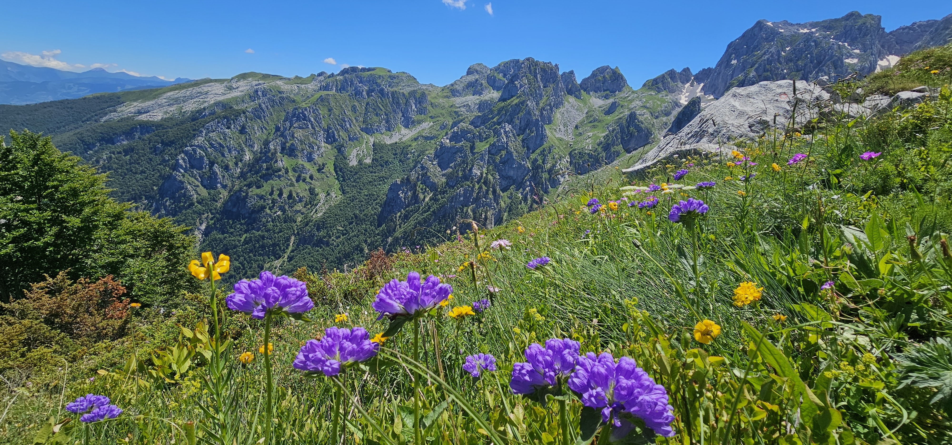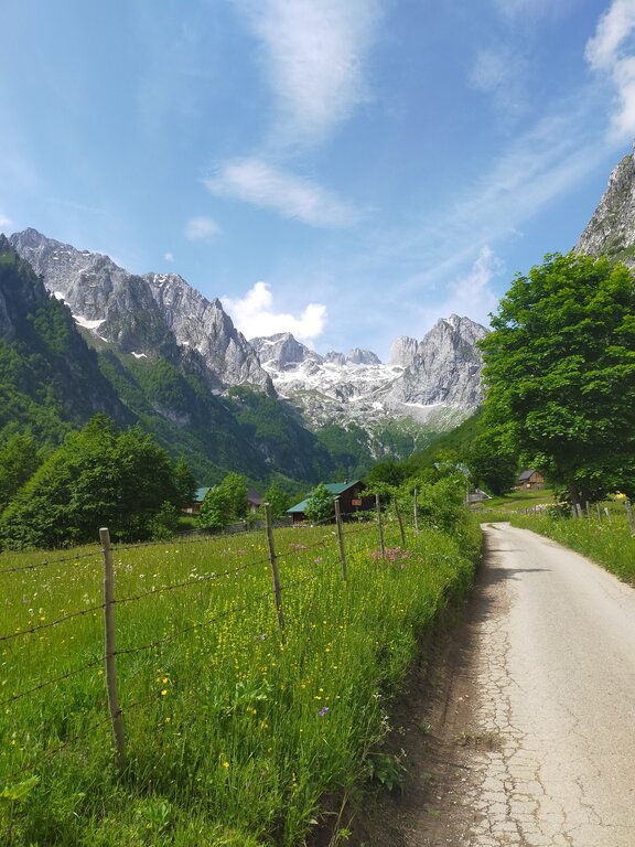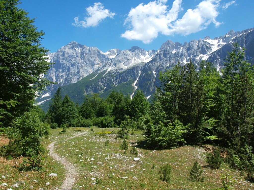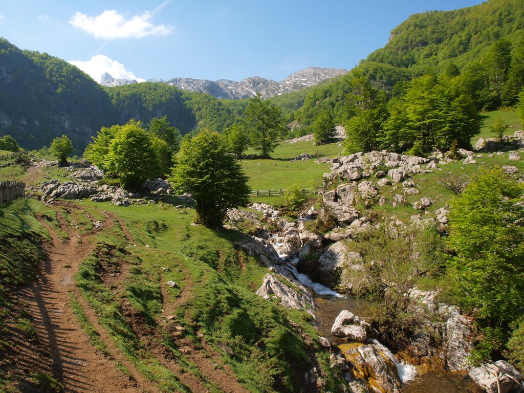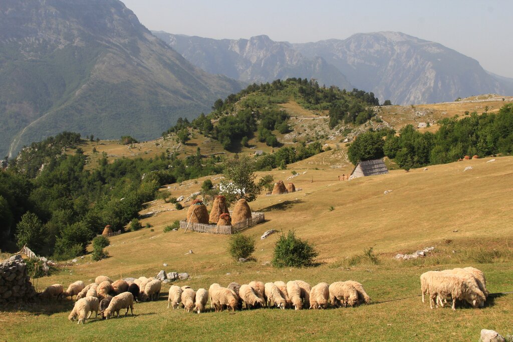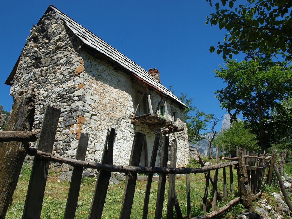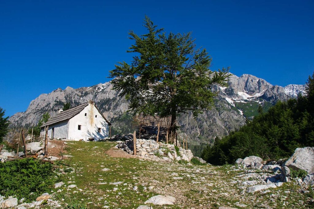<Wir fahren am Morgen ins abgelegene Dorf Kukaj, wo nur noch zwei Familien leben. Von hier steigen wir über blühende Wiesen und lichte Buchenwälder zur Alm von Rama (1650 m) auf. Unterwegs begegnen wir Pferden und Schafen, oben empfängt uns eine Hirtenfamilie, die den Sommer hier verbringt. Bei einer Pause genießen wir den weiten Blick ins Valbona-Tal. Wer möchte, wandert nochmals 2,5 Stunden weiter bis zur albanisch-montenegrinischen Grenze auf 2045 m, wo ein alter Grenzstein dramatische Ausblicke in die Prokletije eröffnet. Beim Rückweg begleitet uns der Anblick des mächtigen Jezerca (2694 m), höchster Gipfel der Dinariden. Unten im Tal bleibt Zeit für ein erfrischendes Bad im Fluss oder zum Ausruhen, bevor wir am Abend in gemütlicher Runde den Sonnenuntergang über den Bergen erleben.