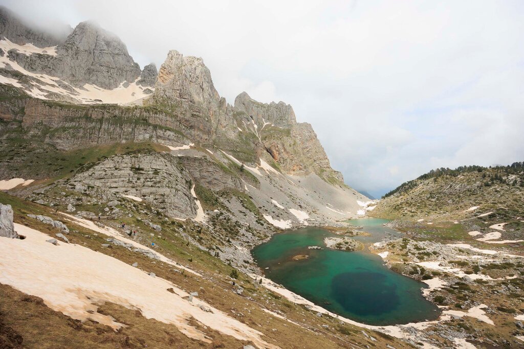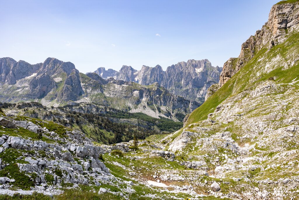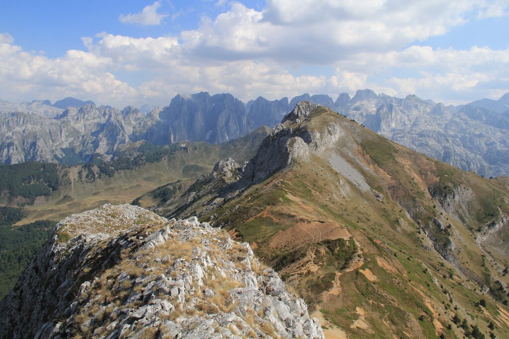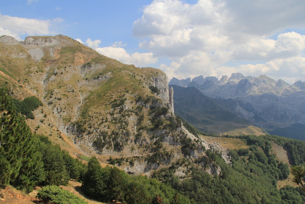 <Ein neues Abenteuer beginnt mit einer spannenden Grenzwanderung und wir fahren zunächst über eine holprige Piste ins abgelegene Cerem-Tal (1180 m). Unser Wanderweg führt durch dichte Wälder und saftig grüne Wiesen hinauf zum Cerem-Pass an der Grenze – hier treffen Albanien und Montenegro aufeinander. Wir halten inne, um das Panorama zu bewundern: Im Norden erkennen wir das mächtige Kollata-Massiv, im Osten ragt Zla Kollata (2534 m) empor, der höchste Berg Montenegros. Am Bor-Pass überqueren wir die Grenze und steigen über karge Karstflächen hinab in das Bergdorf Vusanje. In unserem einfachen Gästehaus, umgeben von unberührter Natur, genießen wir am Abend ein herzhaftes Abendessen.