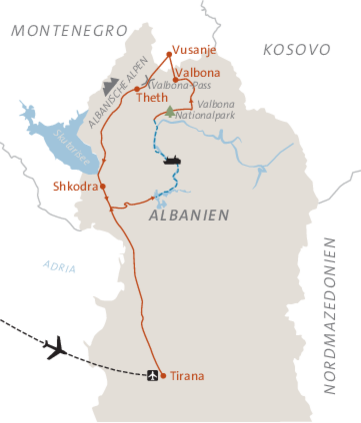 <Ankunft am Flughafen von Tirana. Wer früher ankommt, hat noch Gelegenheit, die lebendige Hauptstadt auf eigene Faust zu erkunden. Um 17 Uhr fahren wir gemeinsam mit dem Bus in den Norden Albaniens. Die Fahrt führt durch fruchtbare Ebenen und vorbei an ersten Hügelketten, bis wir schließlich Shkodër erreichen – eine der ältesten Städte des Landes. Am Abend lassen wir uns ein gemeinsames Essen schmecken, stoßen auf den Beginn unseres Abenteuers an und blicken voller Vorfreude auf die kommenden Tage. Morgen wartet bereits die erste Etappe in den Bergen auf uns.