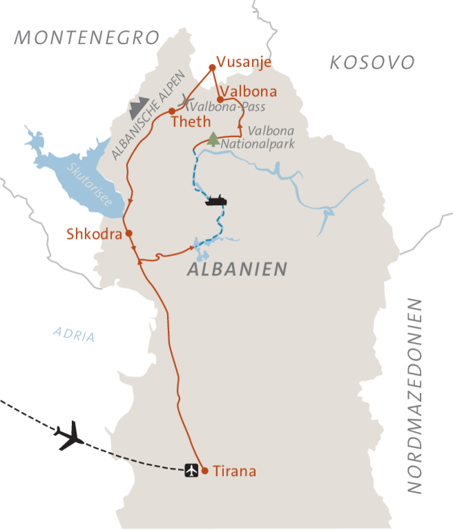 <Frühmorgens erreichen wir den Fährhafen von Koman. Die Morgensonne begrüßt uns, während wir mit dem Schiff über den Koman-Stausee gleiten. Umgeben von steil aufragenden Felswänden dringen wir immer tiefer in die Albanischen Alpen vor. Nach rund drei Stunden erreichen wir Fierze und fahren über kurvige Bergstraßen weiter nach Valbona. In Bajram Curri stärken wir uns mit regionalen Spezialitäten, bevor wir am Nachmittag eine kurze Einführungstour unternehmen: Ein schattiger Pfad führt entlang eines klaren Bachs durch lichten Buchenwald bis zu unserem Berghotel im Valbona-Tal.