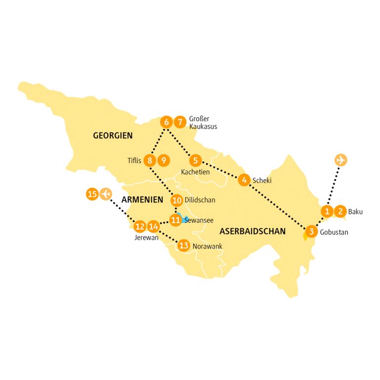 <Du verlässt die aserbaidschanische Hauptstadt in Richtung Nordwesten des Landes. Dein erster Stopp bringt dich zum Diri-Baba-Mausoleum in der Stadt Gobustan. Das zweistöckige Grab ist ein architektonisches Meisterwerk, das einzigartig mit den umgebenden Felsen harmoniert. Der nächste Stopp führt dich zu einer der ältesten und größten Moscheen des Landes, der Juma-Moschee von Schemacha. Angekommen in Scheki startet der Rundgang durch die UNESCO-geschützte Altstadt mit der Besichtigung des Khanspalasts, der im persischen Stil errichteten Sommerresidenz der Khane von Scheki. Außerdem kannst du dich auf eine mittelalterliche Karawanserei, eine Moschee und den Marktplatz dieser einst bedeutenden Stadt an der ehemaligen Seidenstraße freuen. Zum Abschluss des Tages besuchst du eine Werkstatt, in welcher die bunten Shebeke-Fenster, kunstvolle Glasmosaike im Holzrahmen, hergestellt werden, die du schon im Khanspalast bewundern konntest. Ein Kunsthandwerk der besonderen Art, welches viel Geduld und Können erfordert.