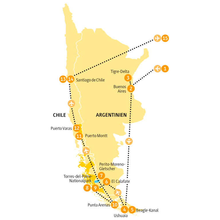 Buenos Aires muss einfach sein, weil du doch schon immer einen spontanen Tango auf der Straße tanzen wolltest. Etwa nicht? Oh doch, aber dann nehmen wir auch schon die Magellan-Route, allerdings im Flieger, damit du möglichst viel Zeit für den Nationalpark Feuerland, den Beagle-Kanal, den Perito-Moreno-Gletscher, die Türme des blauen Himmels, das schönste Seengebiet der Anden und ein überwältigendes Finale in Santiago hast. So viel Kultur muss schon noch sein.