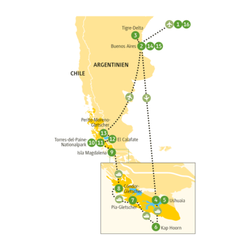 Am Ende der Welt ist es kühl, da können Sie sich in Buenos Aires beim Tango ein bisschen einheizen. Aber dann kommt es knüppeldick. An den eiskalten Gewässern im Nationalpark Feuerland. Bei den Kaiserkormoranen im Beagle-Kanal. Als Augenzeuge, wenn der Perito Moreno-Gletscher kalbt. Bei den »Türmen des blauen Himmels« im Naturwunder Torres del Paine. Und weil es Ihnen nun wieder wärmer werden soll, alles auf Anfang. Zum Finale auf dem Broadway von Buenos Aires.