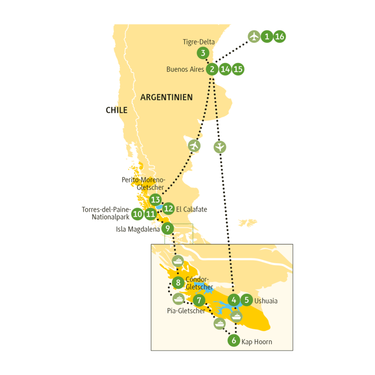 - 13 Übernachtungen in Hotels, Hosterías und auf dem Expeditionsschiff in komfortablen Außenkabinen auf dem Tierra-del-Fuego-Deck