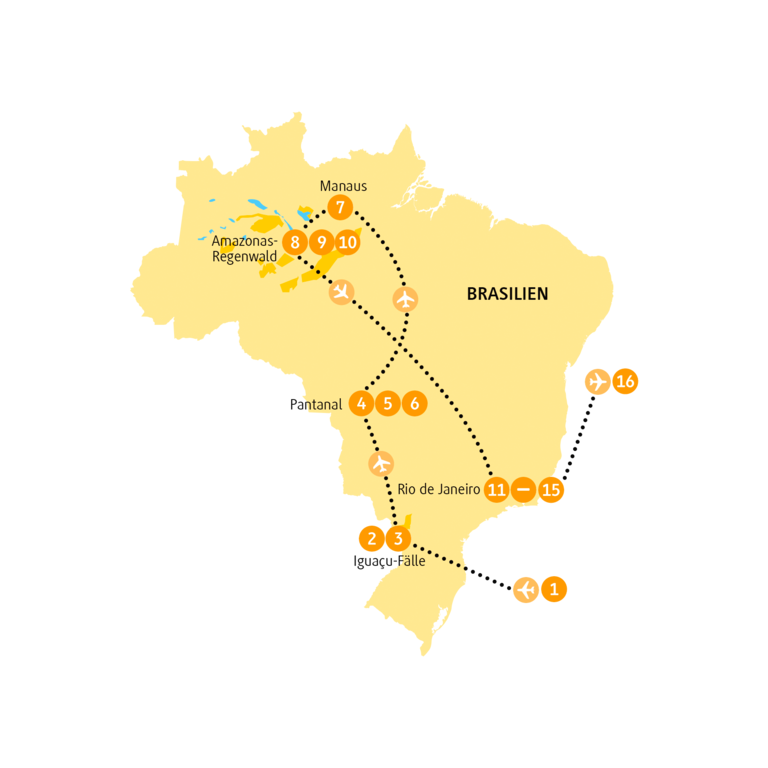 Eigentlich muss man gar nicht viel sagen, es reichen ein paar aufgereihte Namen: Cristo Redentor auf dem Corcovado. Zuckerhut und Copacabana. Die markerschütternde Show der Iguaçu-Fälle, einmal brasilianisch, einmal argentinisch. Brasilia, die Schöpfung Oscar Niemeyers. Blickdichter Urwald. Haufenweise Piranhas.Überlebenstechniken. Geräuschvolle Nächte. Mittendrin die Lodge mit Dschungelbar. Und natürlich das Pantanal, eines der artenreichsten Biotope der Welt.