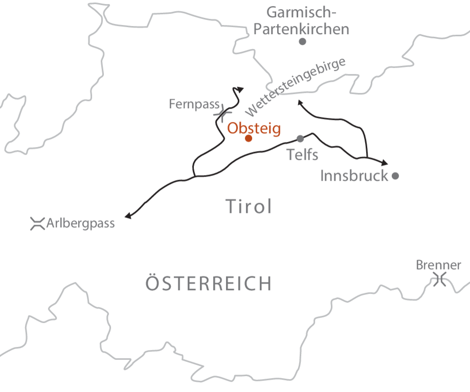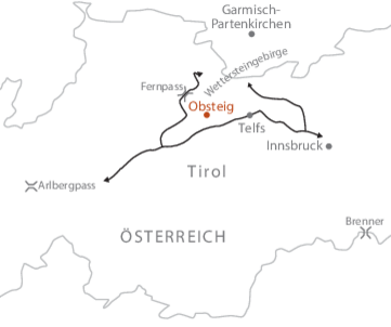 PKW: Autobahn – München – Garmisch – B2 – Mittenwald – Scharnitz – Seefeld – Mösern – Telfs – B189 – Mieming – Obsteig. Kostenlose Parkmöglichkeit direkt beim Hotel.