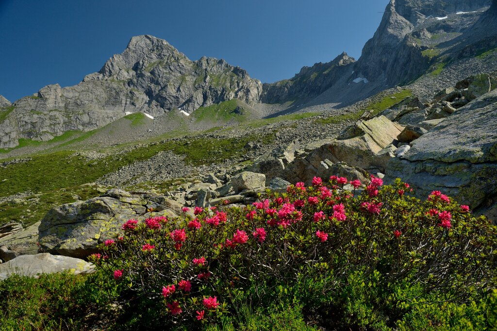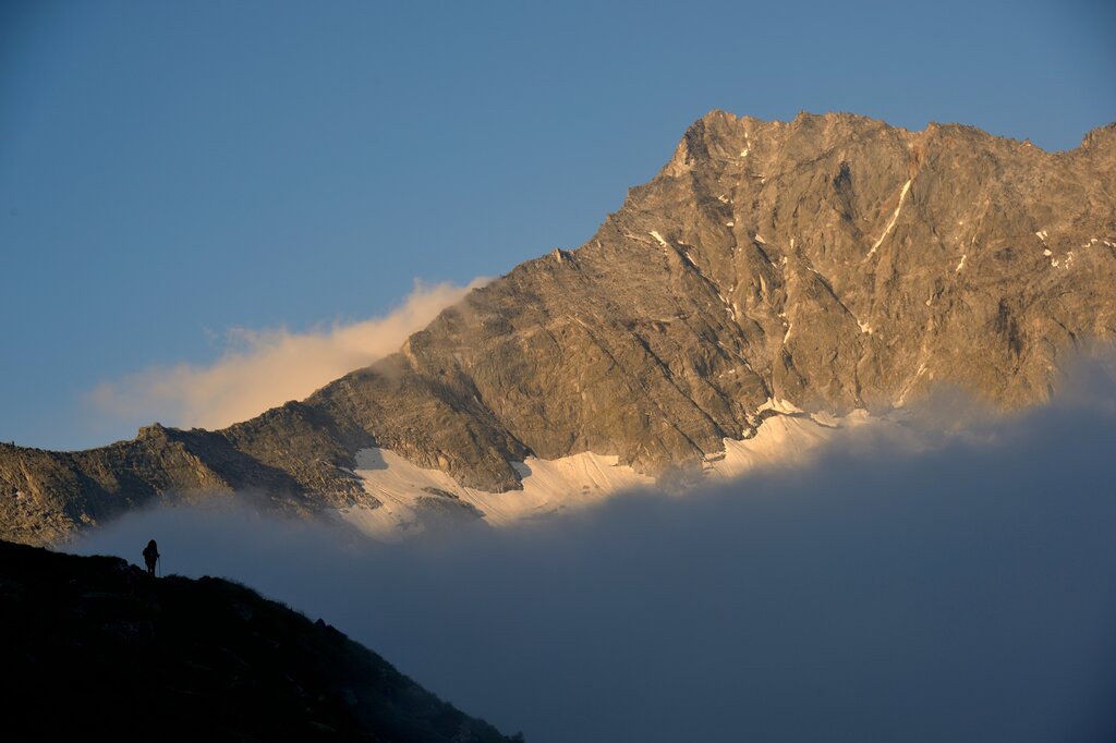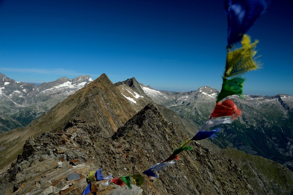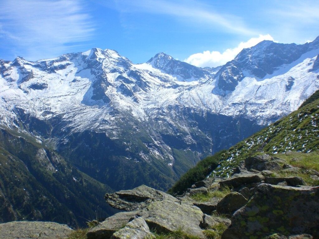 <Der vierte Tag gilt ohne Zweifel als Königsetappe des Berliner Höhenweges. Über blockiges Gelände und schroffe Moränen steigen wir zum Schönbichler Horn (3.134 m) auf – einem markanten Dreitausender, der mitten in einer zerklüfteten Gletscherlandschaft liegt. Der Gipfel ist der unangefochtene Höhepunkt dieser Trekkingtour: Bei klaren Bedingungen reicht der Blick weit in die Zentralalpen hinaus, und selbst der mächtige Ortler scheint zum Greifen nah. Anschließend führt uns der Weg über steilere Passagen hinunter zum Furtschaglhaus, wo wir nach diesem eindrucksvollen Tag einkehren.