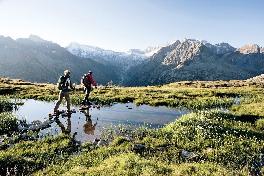 <Vom Furtschaglhaus steigen wir zunächst zum Schlegeisspeicher ab und wandern entlang des türkis schimmernden Wassers zur Olpererhütte, die erhaben über dem See thront. Von dort führt ein schön angelegter Steig weiter hinauf zum Friesenbergsee und schließlich zum Friesenberghaus (2.477 m). Die vergletscherten Gipfel rund um das Schlegeiskees begleiten uns dabei mit einem wunderschönen Panorama. Wer nach unserer Ankunft noch Energie hat, kann mit dem Peterköpfl (2.679 m) einen lohnenden Hüttengipfel besteigen und den Blick über die umliegenden Dreitausender schweifen lassen.