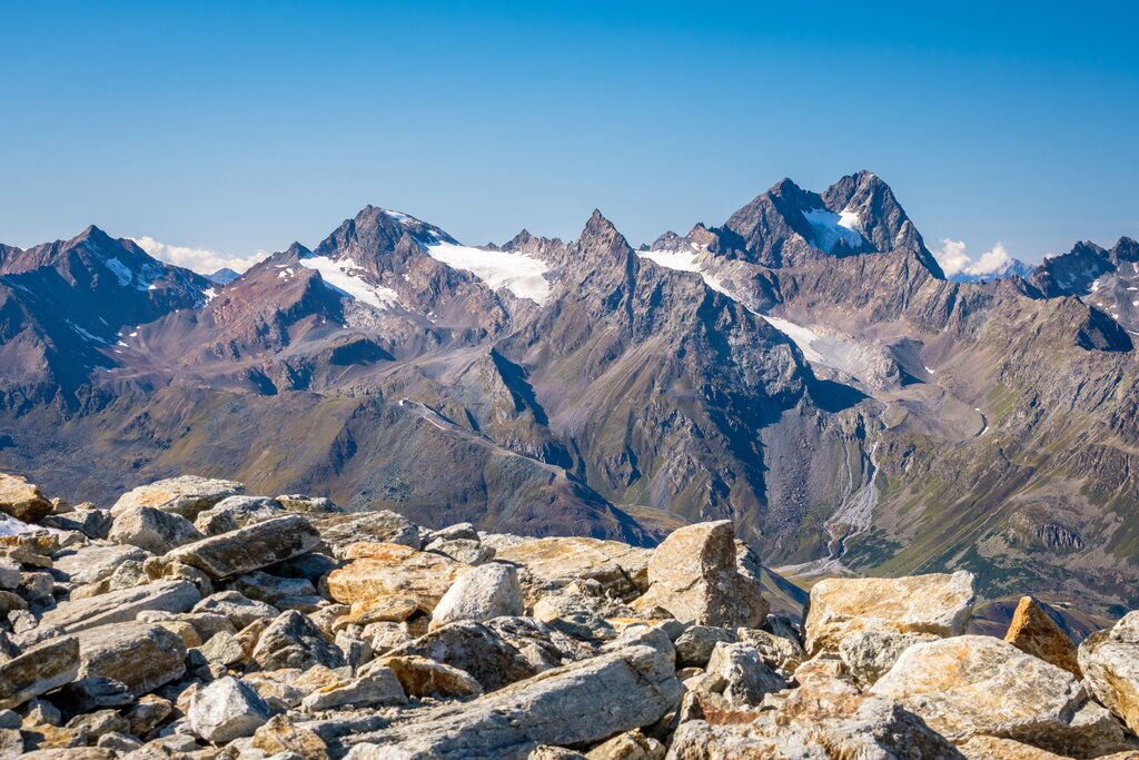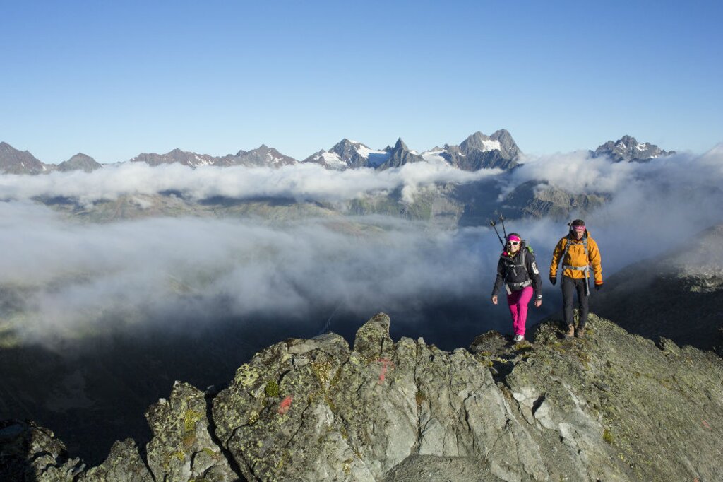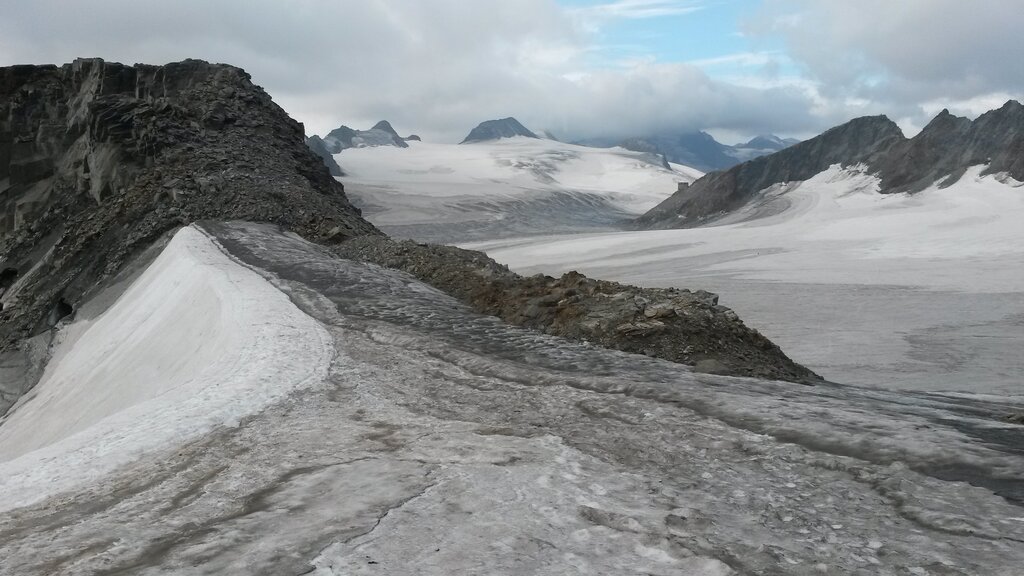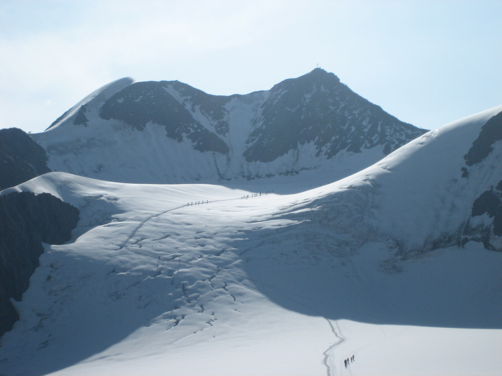 <Über den Kesselwandferner vorbei am Brandenburger Haus geht die Route hinauf zum Fluchtkogel (3.500 m). Von hier lässt sich der Weiterwegbereits erahnen. Der Fluchtkogel ein herrlicher Aussichtsberg mit einem beeindruckendem 360°-Bergpanorama.