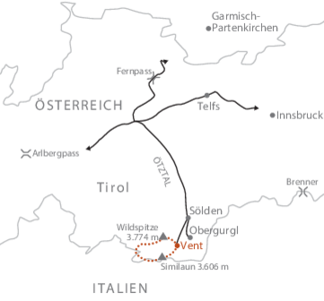 Autobahn München – Innsbruck – Richtung Bregenz – Ausfahrt Ötztal – Sölden – weiter bis Vent (kostenpflichtige Parkplätze am Ortseingang)