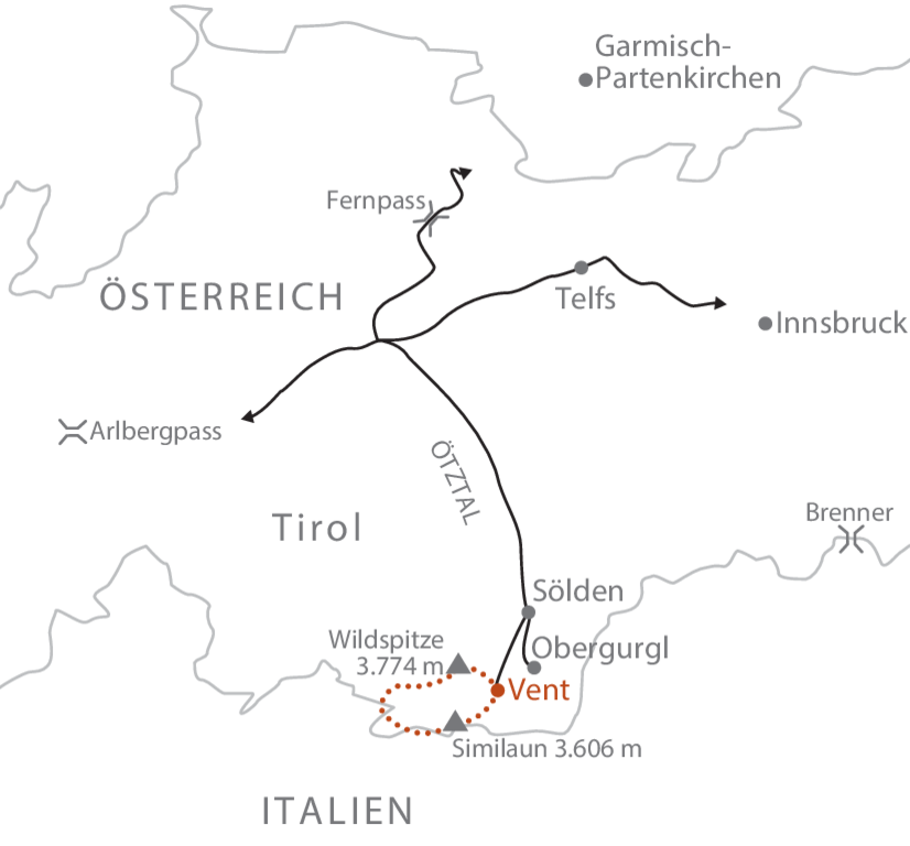 Die Durchquerung der Ötztaler Alpen zählt mit zu den begehrtesten Hochtouren der Ostalpen. Fünf Dreitausender stehen auf unserem Tourenplan, darunter natürlich als Höhepunkt der höchste Gipfel Tirols, die 3.772 Meter hohe Wildspitze. Am Seil unseres Bergführers werden wir den Kesselwandferner und den Taschachferner begehen, an der Ötzi-Fundstelle vorbeikommen und auch eine Besteigung des Similauns (3.599 m) angehen, einem der höchsten Berge Tirols.