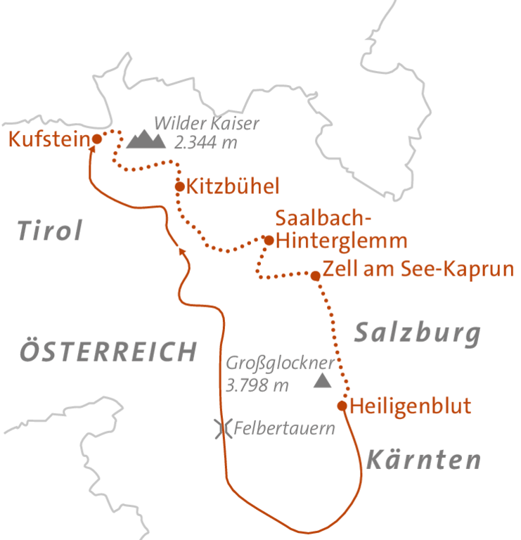 Einmal den Alpenhauptkamm zu Fuß überqueren – diesen Traum erfüllen wir uns auf unserer Alpenüberquerung. Gemeinsam folgen wir unserem Guide auf dem Weg vom Tiroler Unterland bis zu den Füßen von Österreichs höchstem Gipfel, dem Großglockner mit 3.798m. Auf unserer Route übernachten wir in ausgewählten Hotels und Gasthöfen, während der tägliche Gepäcktransfer unsere Wanderungen erleichtert. Nach unserer Anreise ins Kufsteinerland starten wir nach der ersten Nacht ausgeruht in die Tour. Vor uns liegen fünf Etappen voller unvergesslicher Bergmomente: Bereits bei der ersten Wanderung staunen wir über die imposante Kulisse des Wilden Kaisers. Bald queren wir den nächsten Bergkamm Richtung Salzburg und erreichen die Ferienregion Zell am See-Kaprun. Mit dem Großglockner bereits in Sicht lassen wir das Salzachtal hinter uns und nähern uns Schritt für Schritt dem Alpenhauptkamm und unserem Ziel in Kärnten – ein Höhepunkt, den wir gemeinsam erleben und genießen.