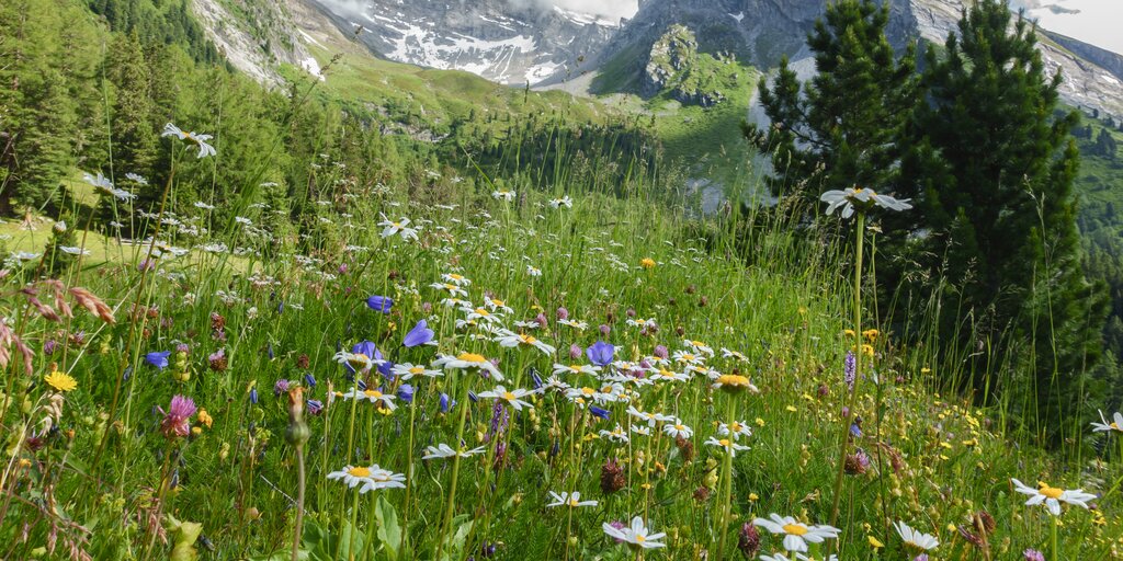 <Heute wandern wir auf den wunderbaren Aussichtsgipfel Blaser (2.241 m), der vor allem für seine Bergblumenpracht bekannt ist. Nach einer stärkenden Einkehr in der Blaserhütte steigen wir nach Steinach ab.