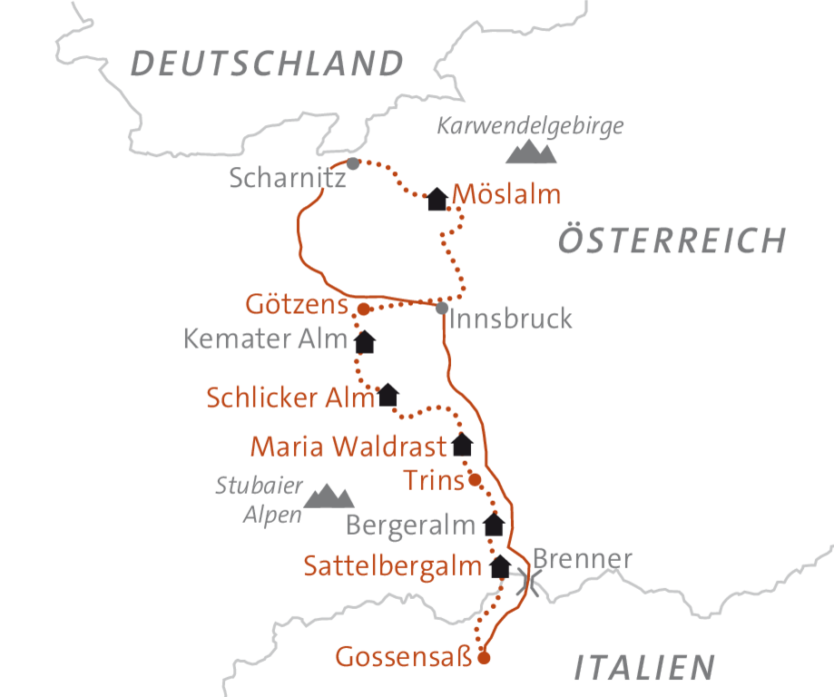 Unsere Alpenüberquerung startet in Innsbruck und führt uns durch das Stubaital, die Schlicker Berge und das Obernberger Tal bis zum Brenner. Wir wandern über Almen, Steige und Hochplateaus, erleben die Bergwelt der Tiroler Bergbauern und genießen weite Ausblicke auf die Kalkkögel und die umliegenden Gipfel. Dabei durchqueren wir vorbei an stillen Bergseen blühende Almwiesen und lichte Wälder, und übernachten unterwegs in gemütlichen Almen, Hütten und einfachen Hotels, die den Charme der Bergwelt widerspiegeln.