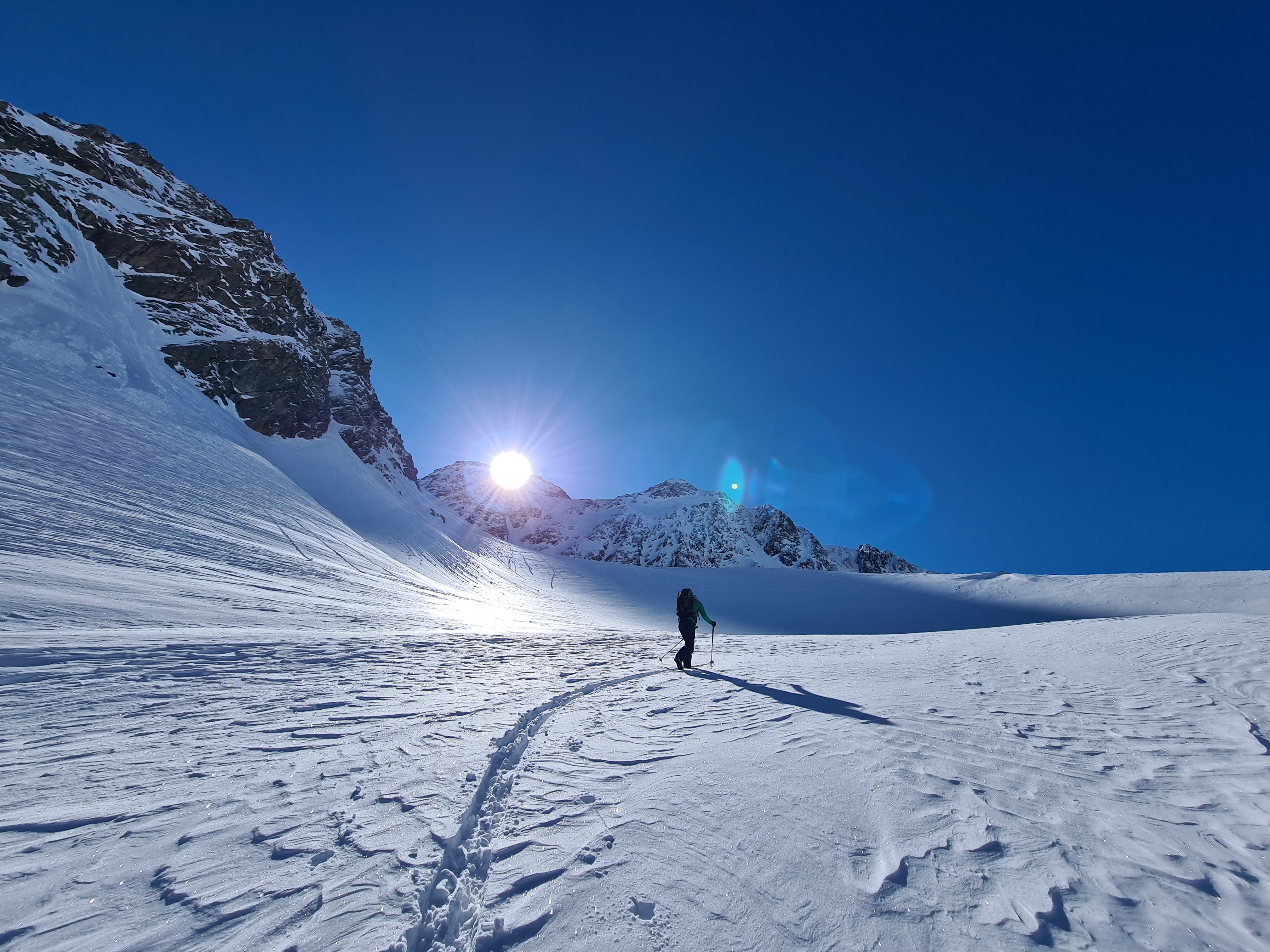 <Am letzten Tourentag wird das Gelernte nochmals in die Tat umgesetzt. Nach der Skitour gemeinsame Abfahrt ins Tal und Rückkehr zu den Autos. Abschluss der Veranstaltung um ca. 15 Uhr.