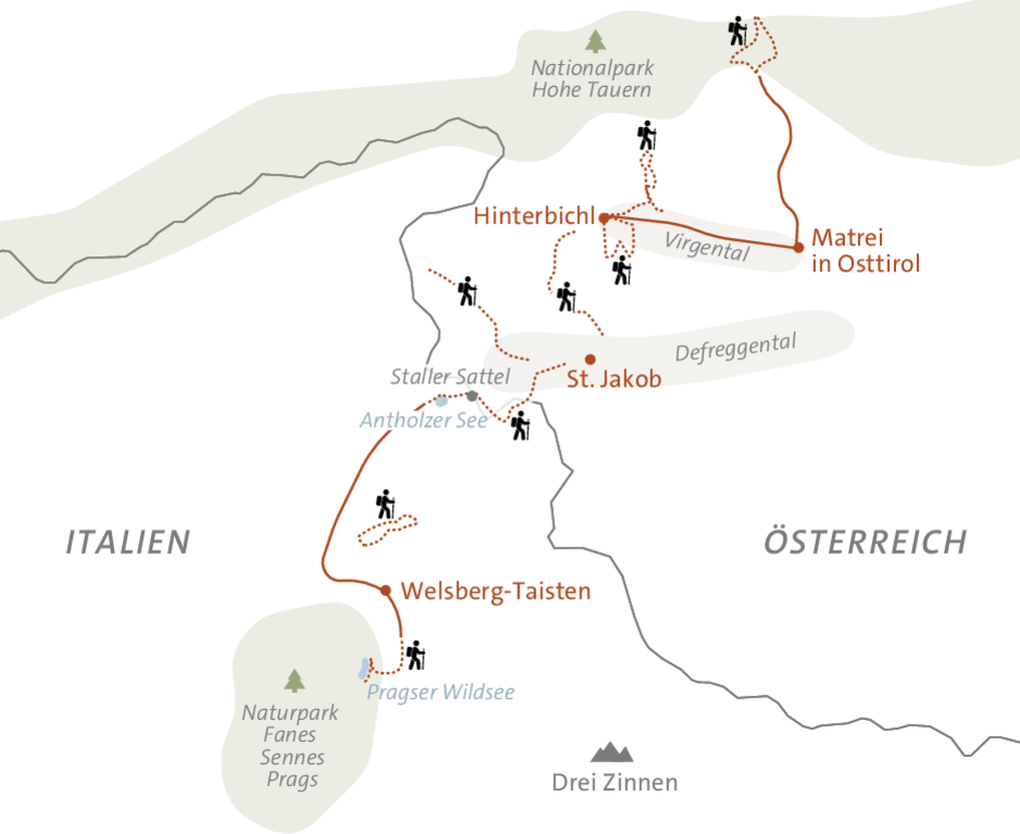 Die Südseite des Alpenhauptkammes überrascht mit einer Landschaft, die Kraft und Ruhe zugleich ausstrahlt: weite Täler, klare Bergseen, stille Almen und Dörfer, in denen das alpine Leben bis heute einen ursprünglichen Charakter bewahrt hat. Osttirol und das Antholzertal gelten als Rückzugsräume für Naturliebhaber – fernab von Massentourismus und überfüllten Wegen. Während dieses Trekkings erkunden wir diese abwechslungsreiche Region in einem angenehmen Rhythmus: Auf jede Talüberschreitung folgt eine Rundwanderung, sodass wir jeweils zwei Nächte in derselben Unterkunft verbringen. Das schafft Zeit zum Durchatmen und ermöglicht es uns, die Landschaften zwischen Großvenediger und Pragser Wildsee bewusst und intensiv zu erleben. Unterwegs genießen wir Dreitausenderblicke von der Bachlenke, entdecken den stahlblauen Eissee, wandern über aussichtsreiche Grasmatten rund um die Taistner Alm und erleben einen der eindrucksvollsten Panoramablicke auf den Pragser Wildsee – besondere Momente, die diese Alpenreise unvergesslich machen.