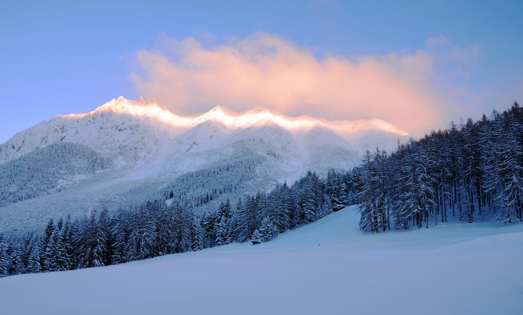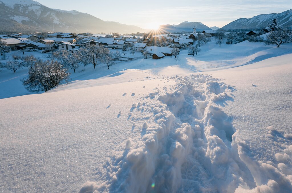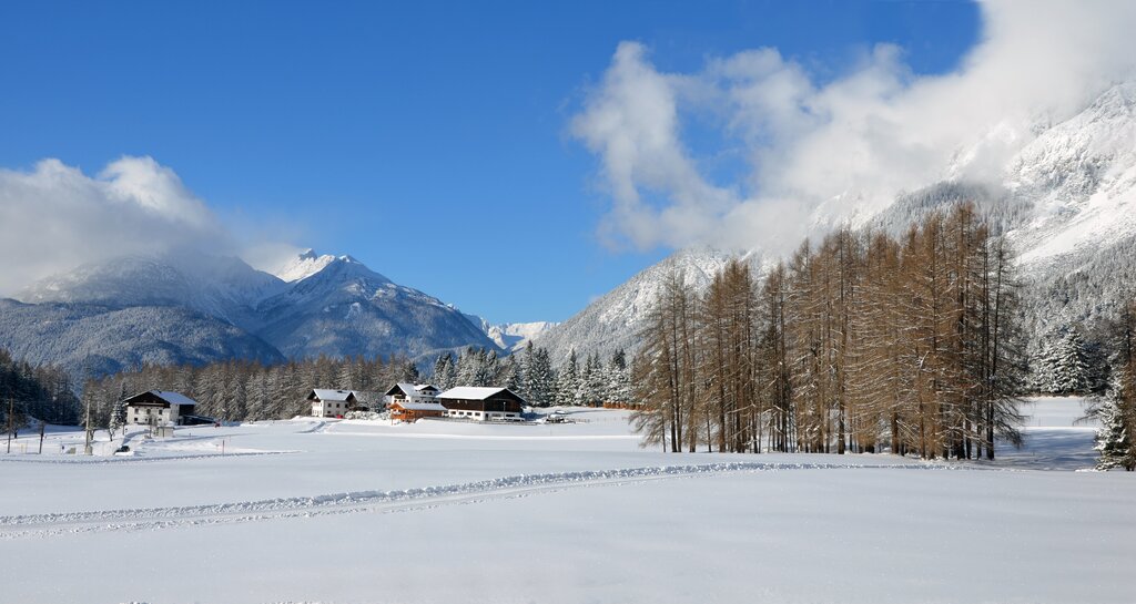 Das Sonnenplateau oberhalb des Inntals macht seinem Namen alle Ehre: Hoch über dem Tal, am Fuße des imposanten Mieminger Gebirges, eröffnet sich uns ein weites, lichtdurchflutetes Winterparadies. Verschneite Wälder, glitzernde Wiesen und stille Almen prägen diese ruhige Region – ideal, um Abstand vom Alltag zu gewinnen und die klare Bergluft tief einzuatmen. Auf unseren Winter- und Schneeschuhwanderungen entdecken wir die sanfte Schönheit dieser Landschaft Schritt für Schritt. Gut präparierte Wege und abwechslungsreiche Routen führen uns durch die idyllische Hochebene, vorbei an urigen Hütten, kleinen Wasserfällen und malerischen Aussichtspunkten. Immer wieder genießen wir beeindruckende Blicke hinunter ins Inntal und hinüber zu den schroffen Gipfeln der nördlichen Kalkalpen. Ein besonderer Moment unserer Woche ist die aussichtsreiche Besteigung des Faltegartenköpfls: Von hier aus reicht der Blick weit über die Winterberge Tirols – ein Panorama, das uns sicher noch lange in Erinnerung bleibt.