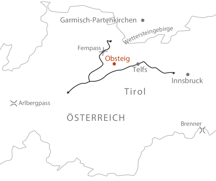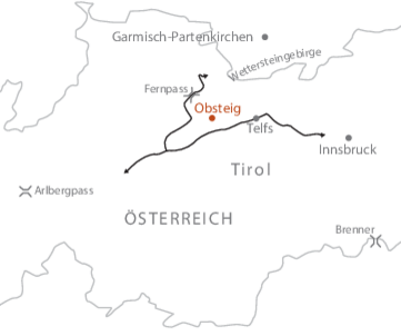 PKW: Autobahn – München – Garmisch – B2 – Mittenwald – Scharnitz – Seefeld – Mösern – Telfs – B189 – Mieming – Obsteig. Kostenlose Parkmöglichkeit direkt beim Hotel.