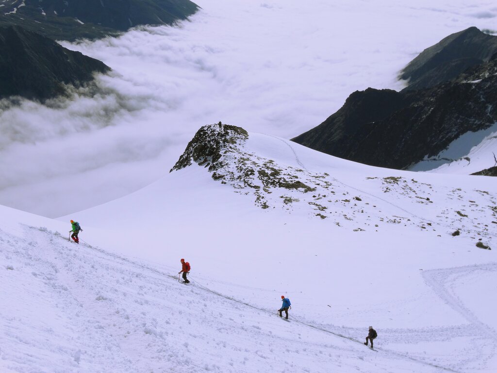 <Wie man als Seilschaft auf einem leichten Felsgrat unterwegs ist, werden wir heute auf Tour üben. Je nach Verhältnissen sind wir entweder am Fuscherkarkopf NW-Grat, am Johannisberg NW-Grat oder am Großen Bärenkopf unterwegs. Das Anbringen von Fixpunkten und Legen von Köpfl-Schlingen, die Ausnutzung des Geländes zum Sichern werden wir lernen. Auch am Mittleren Burgstall in Hüttennähe findet sich geeignetes Gelände zum Üben der Klettertechniken und Setzen von Sicherungen. Am Abend dann gemeinsame Tourenplanung für die Glockner-Besteigung. -