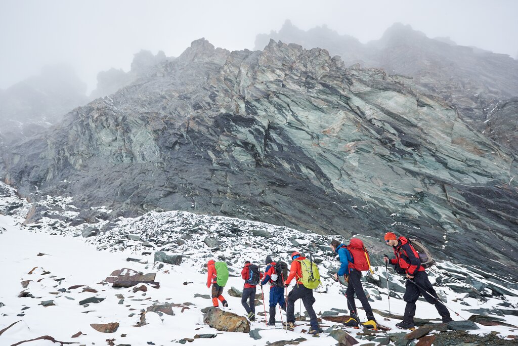 - Knöchelhohe Bergschuhe mit verwindungssteifer Profilgummisohle, mindestens bedingt steigeisenfest (Kategorie C, wir empfehlen Kategorie D)