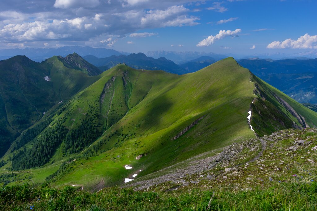 <Mit Gondelbahn Fusleck überwinden wir leicht die ersten Höhenmeter auf dem Weg zum Schuhflicker. Von der Bergstation geht es kurz bergab zum Arltörl, dann stetig, mit prächtigen Weitblicken ins Gasteiner und Großarl Tal, aufwärts zum Schuhflicker, der markant zwischen den beiden Tälern thront. Markant auch deshalb, weil er einer von nur drei Kalkbergen in der ansonsten durch Schiefergestein geprägten Landschaft ist. Nachdem wir unser Gipfelglück ausgekostet haben, steigen wir ab zur Mittagsrast an der Grabneralm. Ein letzter kurzer Anstieg bringt uns dann zurück zur Gondelbahn und wir schweben zurück ins Tal.