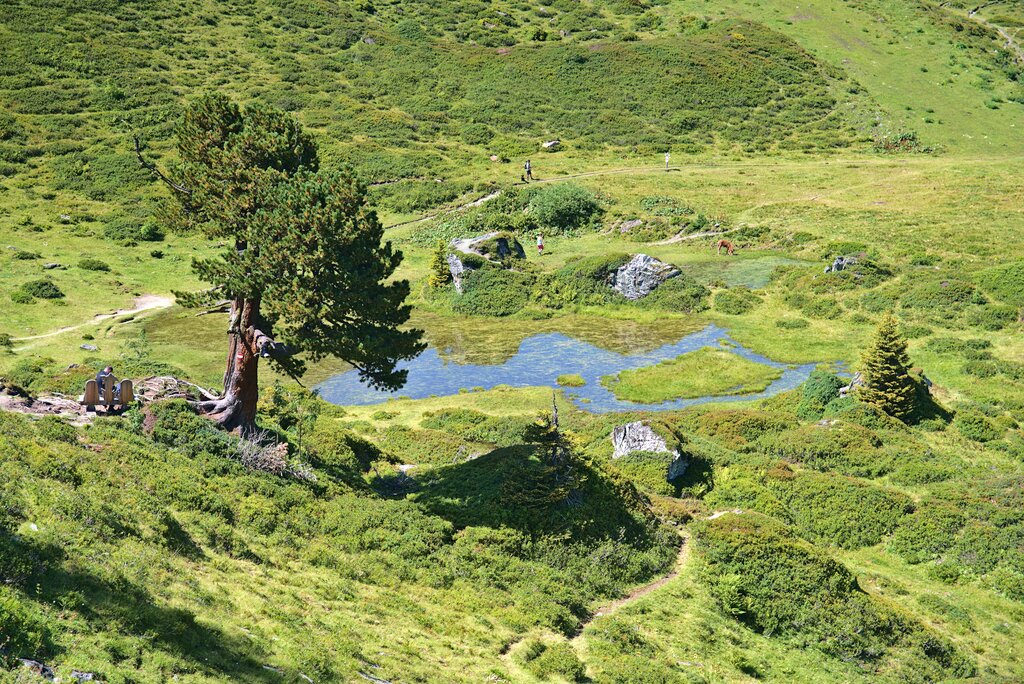 <Heute steht die Überschreitung ins Rauristal an. Nach der Busfahrt zum Naßfeld wandern wir hinauf zum großen Bockhartsee und erleben oberhalb der Baumgrenze die felsige, hochalpine Landschaft des Nationalparks Hohe Tauern. Über die Bockhartscharte gelangen wir ins Rauristal, dessen Talschluss Kolm Saigurn im 16. Jahrhundert Hochburg des Goldbergbaus und Zufluchtsort für Verfolgte war – daher der Beiname "Tal der Gesetzlosen". Beim Abstieg laden Almen zu Rast ein, bevor wir mit dem Taxi ins Gasteinertal zurückkehren.