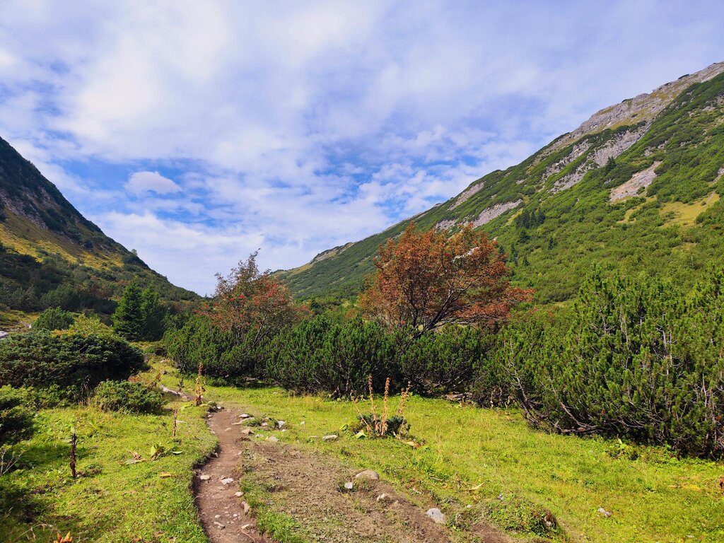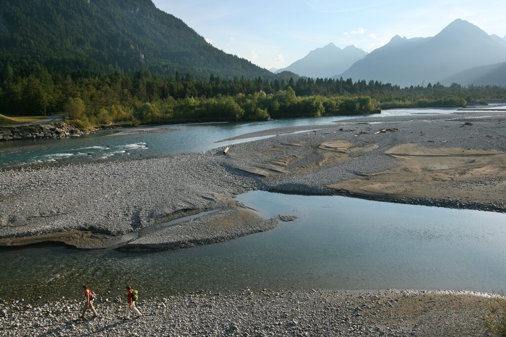 <Wir folgen dem Panoramaweg in Richtung Steeg. Zwischen Lech und Warth hat sich der Fluss tief in das Tal eingegraben, der Weg verläuft oberhalb der Lechschlucht. Immer wieder blitzt in der Tiefe das magische Türkis des Flusses auf.