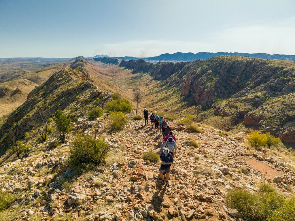 <Von Standley Chasm aus folgen wir dem spektakulären Bridle Trail, einer alten Handelsroute, die von den frühen Siedlern der Region genutzt wurde. Wir steigen auf und folgen der Kammlinie über den Reveal Saddle zum Brinkley's Bluff. Von diesem Hochpunkt in knapp über 1100 m Höhe werden wir mit einem herrlichen Blick auf die von den West MacDonnell Ranges gebildete Gebirgskette belohnt. Nach dem Mittagessen geht es steil bergab und wir kommen an der Mintbush Spring vorbei, benannt nach der einheimischen Pflanze, die hier wächst, einem herrlich nach Minze duftenden Busch, der mit Salbei und Lavendel verwandt ist. Unser einladender Campingplatz befindet sich heute am friedlichen Birthday Waterhole.