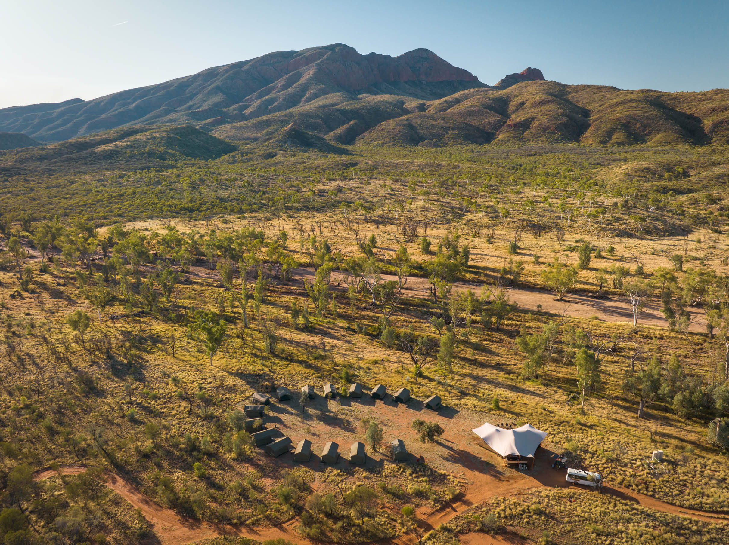 Während Ihrer Wanderung übernachten Sie in unseren exklusiven Öko-Komfort-Camps. Diese Wildniscamps liegen in den Hügeln direkt am Larapinta Trail und bieten einen entspannenden und komfortablen Aufenthalt in abgelegenen Gegenden. Unsere exklusiven Öko-Komfort-Camps sind komplett eingerichtet, so dass Sie sich keine Gedanken über das Aufstellen oder Einpacken der Zelte machen müssen. Jeder Platz verfügt über einen großen, überdachten Bereich, in dem man sich am Ende eines Wandertages entspannen kann, mit Lounges, Esstisch und Küche. Neben diesem schattigen Gemeinschaftsbereich befindet sich unser Lagerfeuer, der perfekte Ort, um sich bei Sonnenuntergang zu treffen. Die Sanitäranlagen sind sauber und komfortabel. Alle Toilettenabfälle werden in einen Kompostierbehälter geleitet, um die Umwelt zu schützen. Es gibt einfache Duschmöglichkeiten: Ein Eimer mit über dem Feuer erhitztem Wasser wird aufgereiht und bietet ein paar Minuten lang eine herrlich heiße Dusche. Das gesamte Wasser wird per Tankwagen herangeschafft, da es in den trockenen Gebirgszügen keine geeigneten lokalen Wasserquellen gibt. Die Zelte im Safaristil bieten ausreichend Platz für zwei Personen und Ausrüstung. Das Gepäck sollte stets im Zelt aufbewahrt werden, um zu verhindern, dass Dingos Schuhe und andere Gegenstände mitnehmen. Wenn Sie als Einzelreisender buchen, erhalten Sie ein kostenloses Upgrade auf Ihr eigenes Privatzelt. Sie schlafen auf einer Liege in einem Swag. Die Liegebetten heben Sie 40 cm vom Boden ab und bieten eine feste, flache Unterlage für die bequeme Swag-Matratze. Der Swag besteht aus einer 5 cm dicken Schaumstoffmatratze, die mit einer Plane abgedeckt ist. Wir stellen ein Baumwoll-Spannbettlaken, ein Kopfkissen und einen Kopfkissenbezug zur Verfügung, die Sie für die gesamte Reise behalten. Sie können Ihren Swag außerhalb des Zeltes mitnehmen und unter dem Sternenhimmel schlafen, wenn Sie das echte Outback-Erlebnis suchen. Schlafsäcke sind für die Wärme unerlässlich. Sie können Ihre eigenen mitbringen oder bei uns ausleihen - bitte kontaktieren Sie unser Team, wenn Sie einen mieten möchten, mindestens 14 Tage vor Ihrer Abreise. Wenn Sie einen Schlafsack mieten, erhalten Sie eine Seidenschlafsackeinlage. Auf den Campingplätzen können Sie Ihre Geräte über USB-Anschlüsse im Aufenthaltsbereich aufladen. Die Anschlüsse sind sehr begrenzt und werden von den Teilnehmern gemeinsam genutzt. Das Aufladen erfolgt über Solarzellen und kann daher länger dauern als üblich. Wir empfehlen, tragbare Ladegeräte oder voll aufgeladene Ersatzakkus als Reserve für Ihre Geräte mitzubringen.