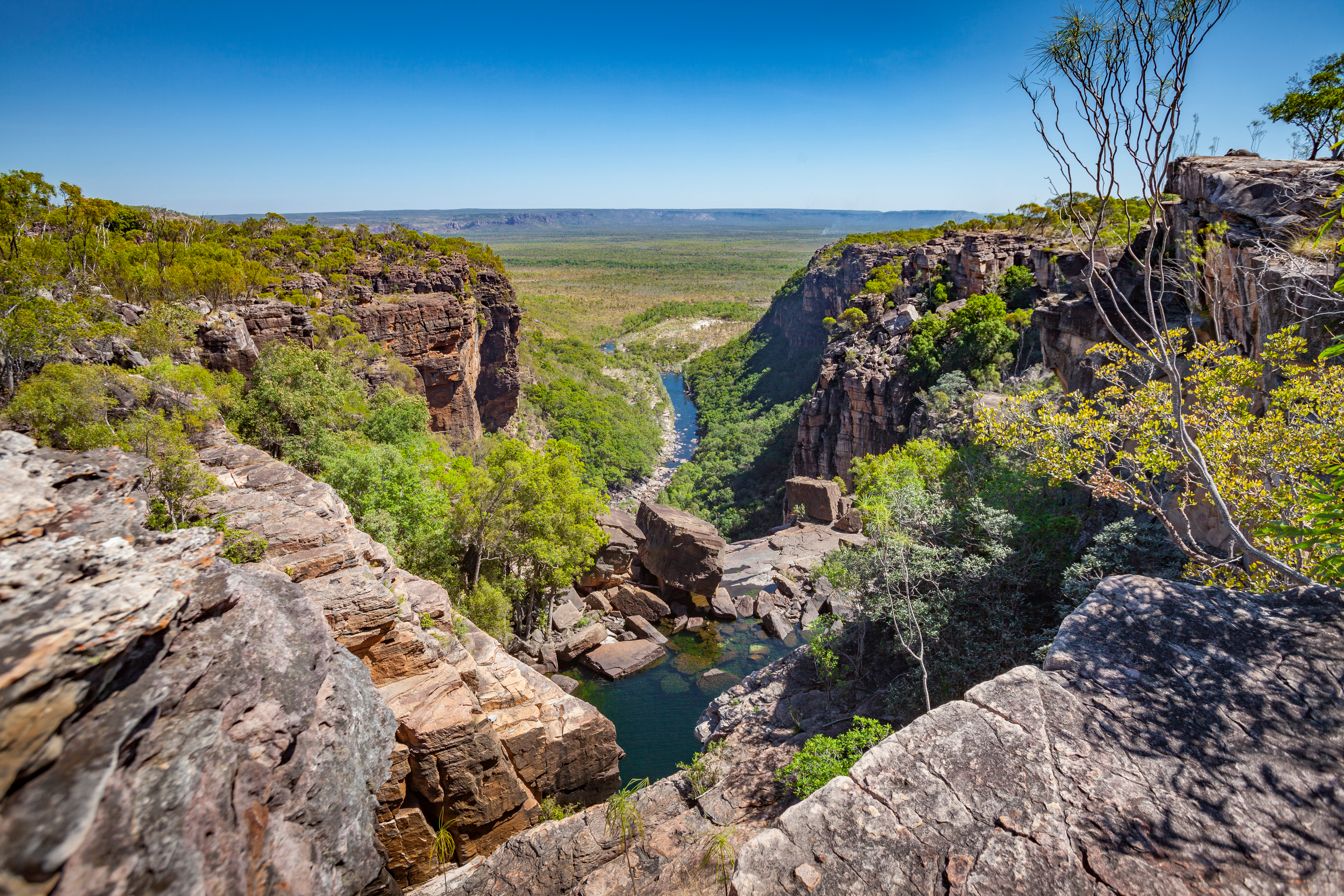 <Wir wachen auf mit dem Morgengesang der zahlreichen Vögel der Savanne und Feuchtgebiete. Der heutige Tag steht ganz im Zeichen atemberaubender Wanderungen im zum UNESCO-Weltnaturerbe gehörenden Nationalpark. Unsere Guides wählen je nach Zugänglichkeit zu den Jim Jim Falls eine von zwei Optionen aus – diese Entscheidung wird von den Traditionellen Eigentümer*innen und den Ranger*innen des Nationalparks getroffen.