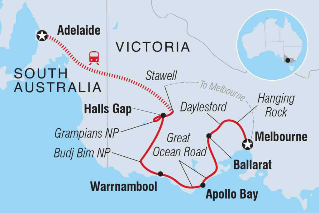 Es ist sehr wichtig, dass du pünktlich zum Beginn deiner Tour kommst, denn wir werden uns sofort auf den Weg machen. Weitere Einzelheiten findest du im Abschnitt "Anweisungen zum Treffpunkt" in deinen Grundlegenden Reiseinformationen. Wir empfehlen dir, eine Nacht vor Beginn deiner Tour in Melbourne zu verbringen. Die Gipfelwanderung im Hanging Rock Reserve ist eine Wanderung der Stufe 3 (mittelschwer) mit einem steilen Anstieg, bei dem du über Felsen laufen musst. Die Wanderung ist 1,8 km lang und dauert etwa 50 Minuten. Für diejenigen, die eine leichtere Variante bevorzugen, gibt es auch die 1,8 km (30 Minuten) lange Basiswanderung oder die 2,3 km (40 Minuten) lange Bachwanderung. -