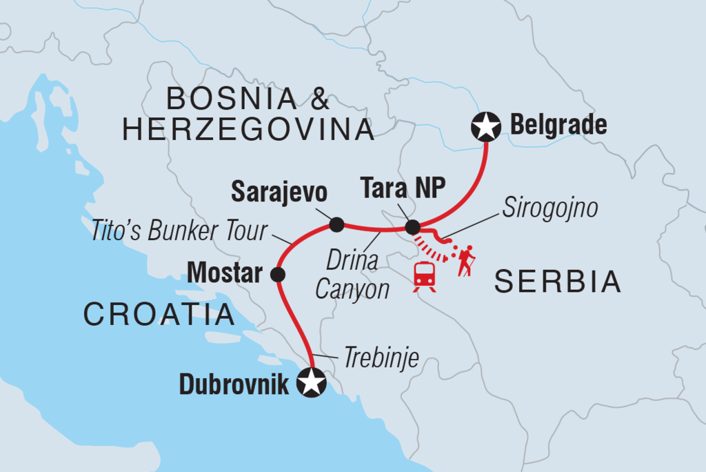 Entdecke die Schönheit und Geschichte des Balkans auf einem achttägigen Premium-Abenteuer, das von Kroatien durch Bosnien und Herzegowina nach Belgrad führt. Spaziere durch die mittelalterliche Altstadt von Dubrovnik, probiere exzellente Balkanweine, erfahre etwas über die Kriegsjahre in Sarajevo, halte an der berühmten Alten Brücke von Mostar und entdecke die spektakuläre Landschaft des Tara-Nationalparks zu Fuß. Fahre mit einem historischen Dampfzug über die Gleise, und wenn die Nacht ruft, entdecke das lebhafte Nachtleben von Belgrad - dein ortskundiger Reiseleiter hat immer die besten Tipps parat. Kombiniere Schlachtfelder, Strände, Bunker und Bars auf einem komfortablen Abenteuer, das Vergangenheit und Gegenwart miteinander verbindet, und reise mit einer kleinen Gruppe gleichgesinnter Reisender.