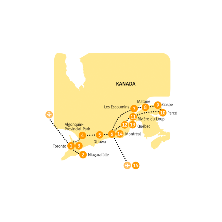 <Noch nicht einmal 24 Stunden im Land des Ahorns und des Eishockeys und schon wartet der erste Höhepunkt auf dich. Doch erst einmal erkundest du die Hauptstadt Ontarios. Toronto ist ein regelrechter Schmelztiegel der Kulturen. Die größte Stadt Kanadas gleicht einem regelrechten Mosaik, dessen Teile aus den verschiedenen Vierteln bestehen. Ein jedes wird dich mit einer anderen Atmosphäre empfangen: Die wuselnde Yonge Street, das vielfältige Chinatown und der geschäftstüchtige Fashion District werden einige Stopps auf unserer ersten Erkundungstour sein. Dann heißt es: Auf gen Südwesten! Das donnernde Wasser hörst du schon vom Parkplatz aus. Und dann taucht es vor dir auf: das Naturwunder der Niagarafälle. Drei separate Wasserfälle, zu denen auch die berühmten Horseshoe Falls gehören. Auf dem Weg zurück nach Toronto halten wir in Niagara-on-the-Lakes. Ein bisschen wie in der Zeit stehen geblieben, lässt du die viktorianischen Häuser auf deinem Spaziergang auf dich wirken. Kaum zu glauben, dass das laute Treiben in Niagara Falls so nah ist.