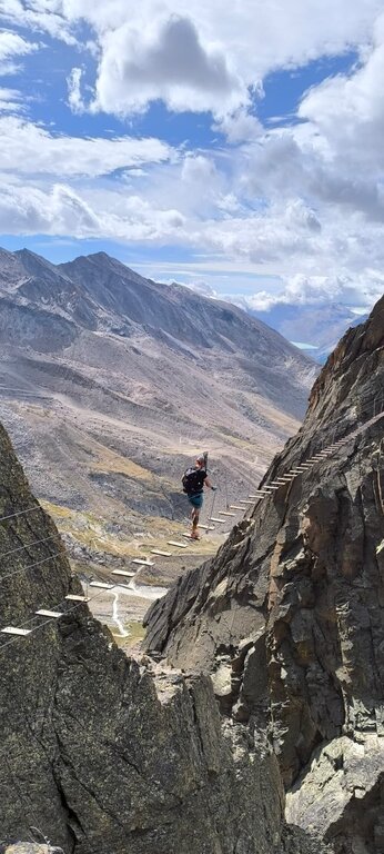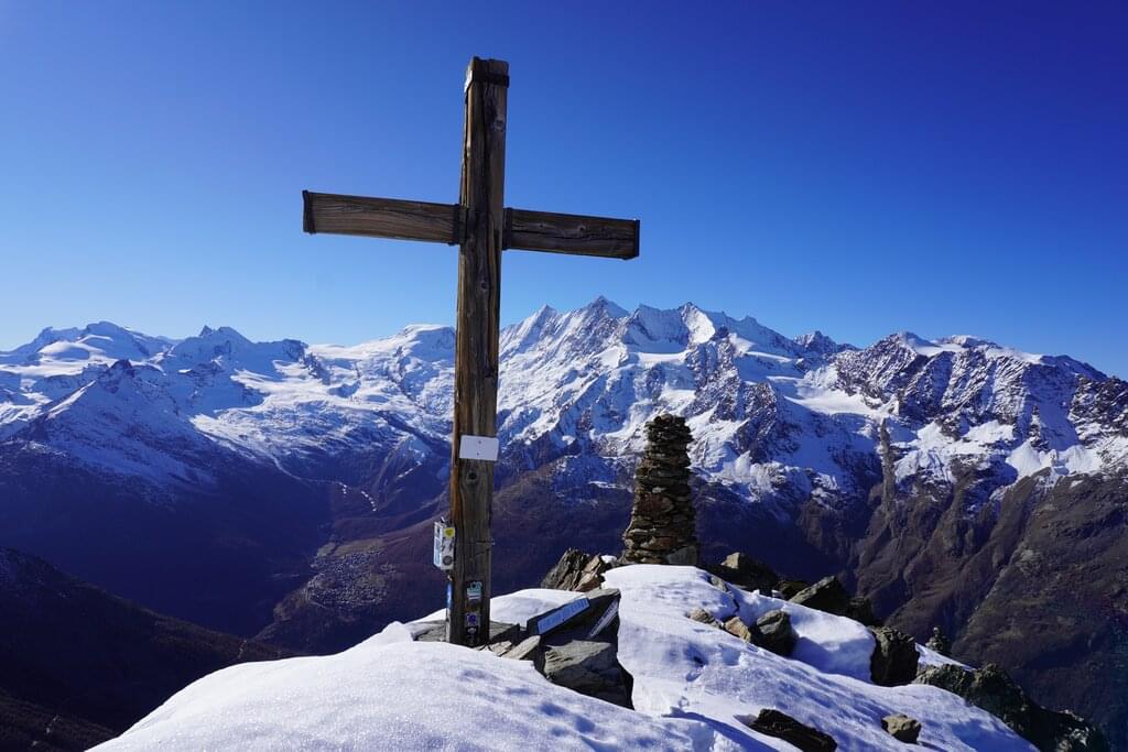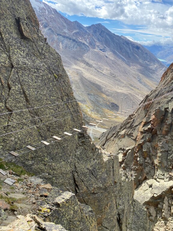 <Heute wartet mit dem Jegihorn (3.206 m) ein beeindruckender Gipfel auf uns. Wir wechseln die Talseite und fahren von Saas-Grund mit der Gondel zum Kreuzboden (2.399 m). Von dort beginnt unser Anstieg über den Klettersteig – einer der höchstgelegenen in den Alpen und im Schwierigkeitsgrad C/D angesiedelt. Die luftige Route führt über Leitern, Bänder und Felsgriffe stetig nach oben, bis wir schließlich den Gipfel erreichen und ein weites Panorama über das Saastal genießen.