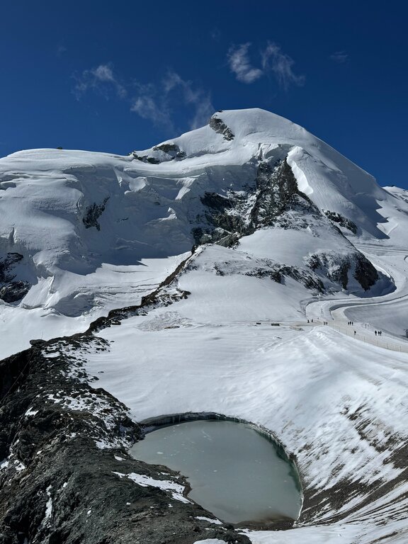 <Das Breithorn (4.164 m) zählt zu den einfacheren Viertausendern des Wallis – ideal, um unser Erlerntes sicher anzuwenden. Nach einem kurzen Spaziergang durch Zermatt und dem ersten Blick auf das majestätische Matterhorn bringt uns die Seilbahn hinauf zur Bergstation Klein Matterhorn (3.883 m). Von dort steigen wir über den Gletscher auf, verfeinern beim Gehen mit Steigeisen unsere Technik und verbessern unser Seilhandling. Schritt für Schritt nähern wir uns dem breiten Gipfel, der mit seinem Panorama noch einmal die ganze Faszination der Hochalpen spürbar macht.