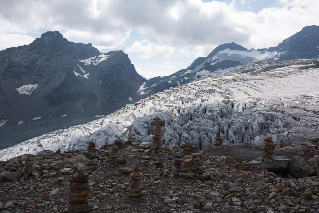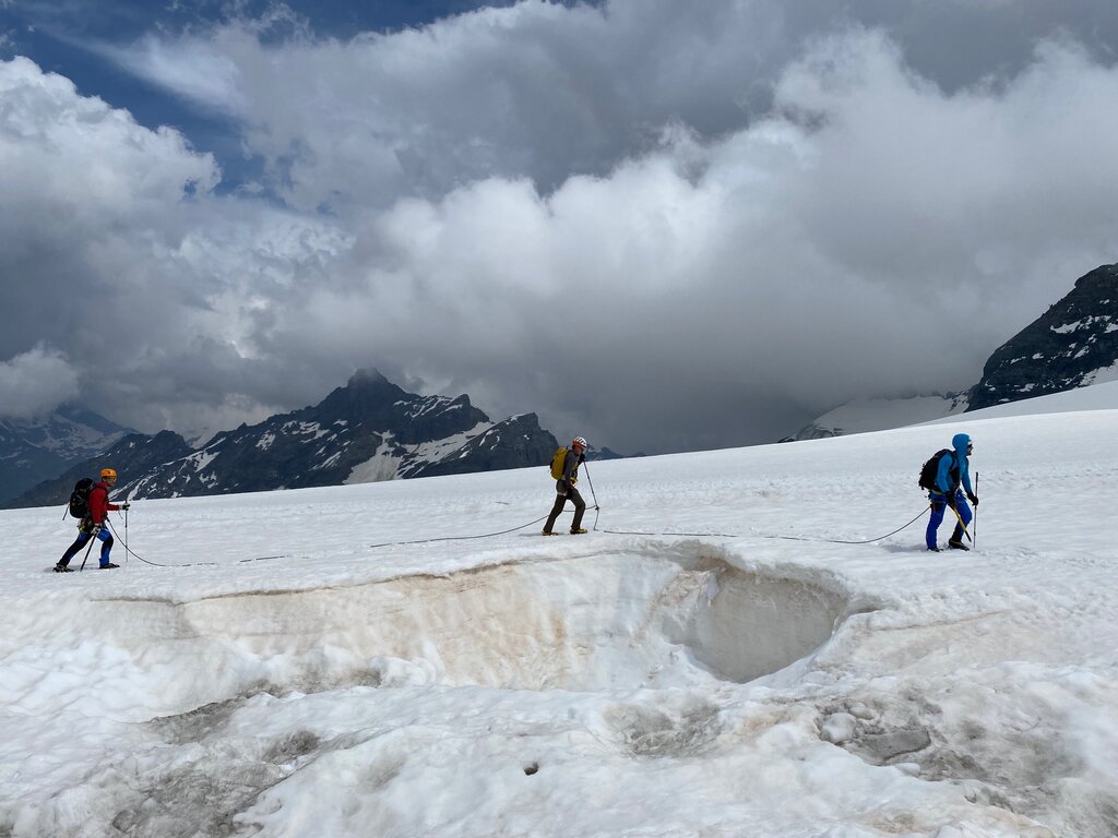 <Mit der Bahn fahren wir hinauf zur Längfluh (2.867 m), die eindrucksvoll am Rand des Feegletschers liegt. Im Blockgelände verbessern wir zunächst unsere Trittsicherheit und üben sauberes Steigen im Fels. Nur wenige Schritte weiter betreten wir das Eis: Wir lernen das Gehen mit Steigeisen, den sicheren Umgang mit dem Pickel und das Anseilen in der Seilschaft. Danach suchen wir eine geeignete Gletscherspalte, um die Grundlagen der Spaltenbergung kennenzulernen und einen Mannschaftszug selbst auszuprobieren.