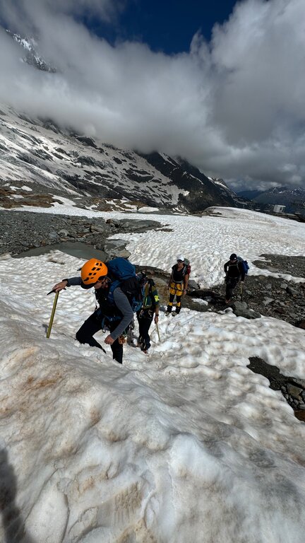 <Um18 Uhr treffen wir uns in Saas-Fee in unserem Talstützpunkt. Beim gemeinsamen Abendessen stellt uns der ASI Bergführer das Programm der kommenden Tage vor und gibt einen ersten Überblick über die geplanten Touren. Anschließend überprüfen wir gemeinsam die Ausrüstung, erhalten das benötigte Leihmaterial und passen die Steigeisen an, damit wir gut vorbereitet in unser Hochtourentraining starten können.
