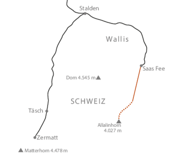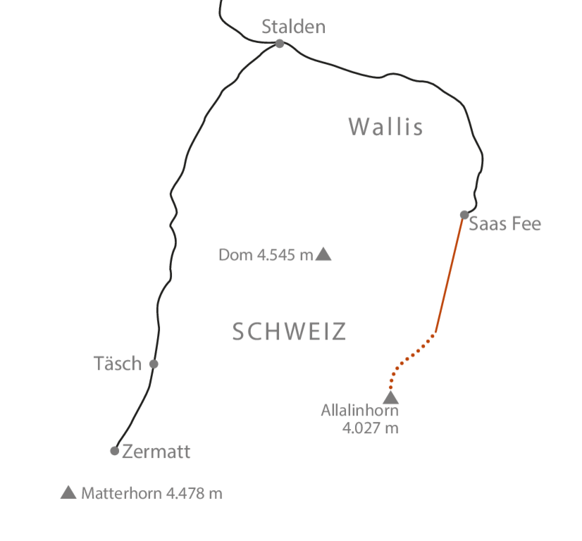 <Mit der Metro-Alpin fahren wir hinauf zum Mittelallalin auf rund 3.500 m – dem Ausgangspunkt für unseren ersten Viertausender. Der Weg zum Gipfel ist von hier nicht mehr weit, genau richtig, um das Gelernte sicher anzuwenden, ohne in der dünnen Luft außer Atem zu kommen. Schritt für Schritt steigen wir höher, bis wir schließlich das Allalinhorn erreichen und das Panorama der Walliser Viertausender genießen. Anschließend steigen wir zurück zur Station Mittelallalin ab und fahren mit der Bahn hinunter nach Saas-Fee.