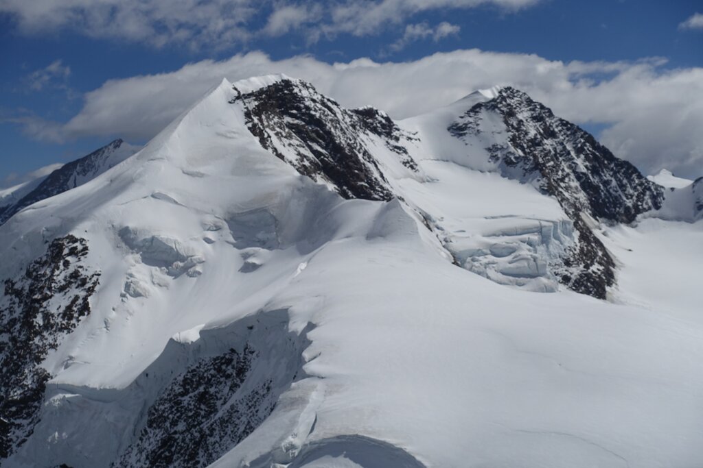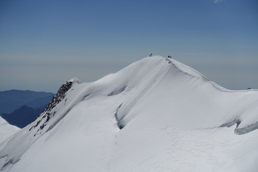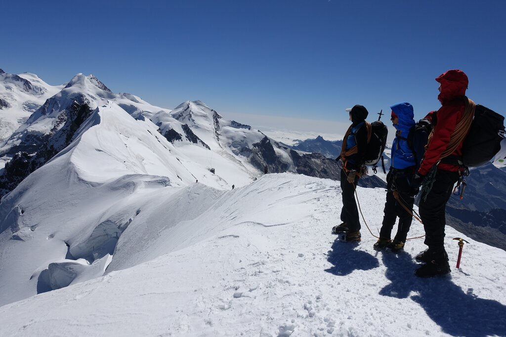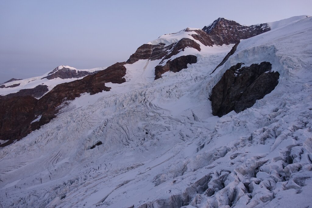<Balmenhorn (4.167 m), Schwarzhorn (4.322 m), Ludwigshöhe (4.342 m), Parrotspitze (4.436 m) und zum Finale die Signalkuppe (4.554 m) mit der höchstgelegenen Hütte Europas direkt auf dem Gipfel. Der heutige Tag ist ein Fest für Viertausendersammler. Von den hohen Gletscherflächen des Monte Rosa aus sind die Gipfel jeweils über Firngrate oder Firnflanken in kurzen Anstiegen erreichbar. -