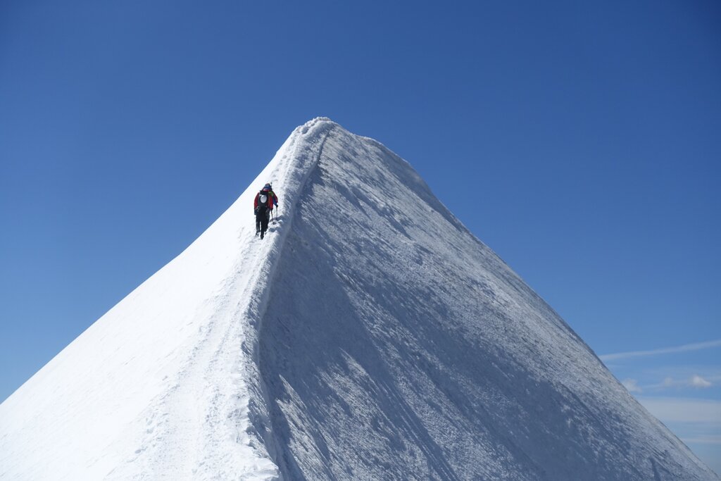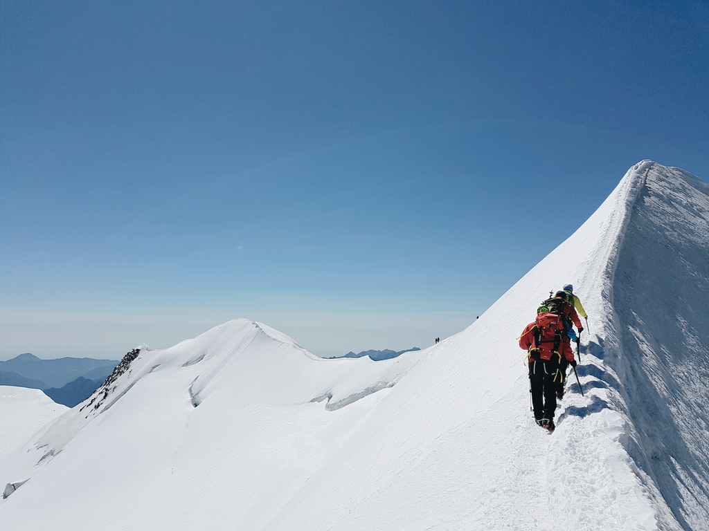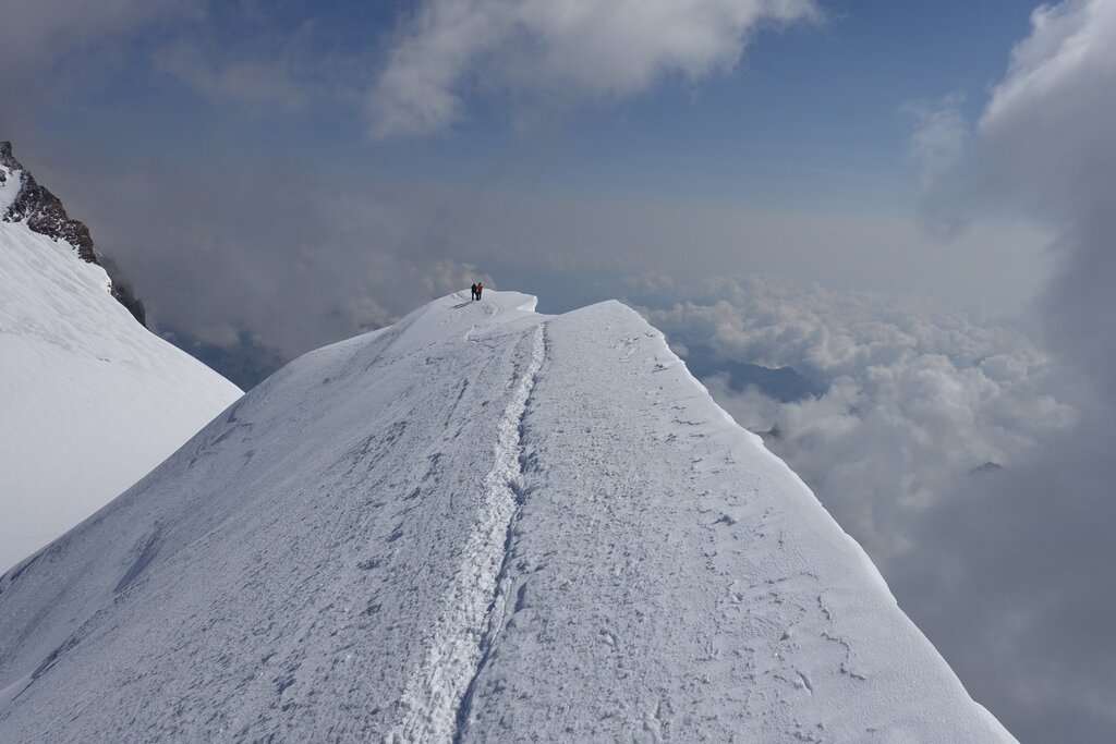 <Ein markantes Zweigestirn bilden die beiden Gipfel von Pollux und Castor. Wir besteigen den höheren der beiden Gipfel, den Castor (4.223 m). Dazu steigen wir auf über eine längere Firnflanke in Schnee und Eis. Auf den letzten Metern zum höchsten Punkt wartet ein fotogener, aber schmaler Firngrat. Nach dieser kurzen Adrenalineinlage geht es vom Gipfel über das Felikjoch abwärts zur Quintino-Sella-Hütte (3.585 m).