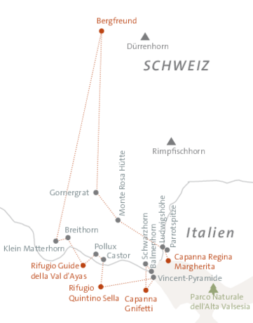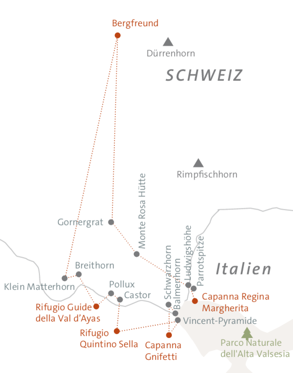 Im Monte-Rosa-Gebiet befindet sich die alpenweit dichteste Ansammlung an Viertausendern. Die technisch meist nicht schwierigen Gipfel sind ein Paradies für konditionsstarke Gipfelsammler. Auf unserer Tour werden wir 10 Berge mit der magischen 4000 Meter Marke besteigen. Von Zermatt aus am Breithorn beginnend führt uns die Route über den Castor bis zum höchsten Punkt unserer Durchquerung, der 4.563 Meter hohen Zumsteinspitze. Unvergesslicher Höhepunkt ist sicher die Aussicht von der höchstgelegenen Hütte der Alpen, der Capanna Regina Margherita auf der 4.554 m hohen Signalkuppe.