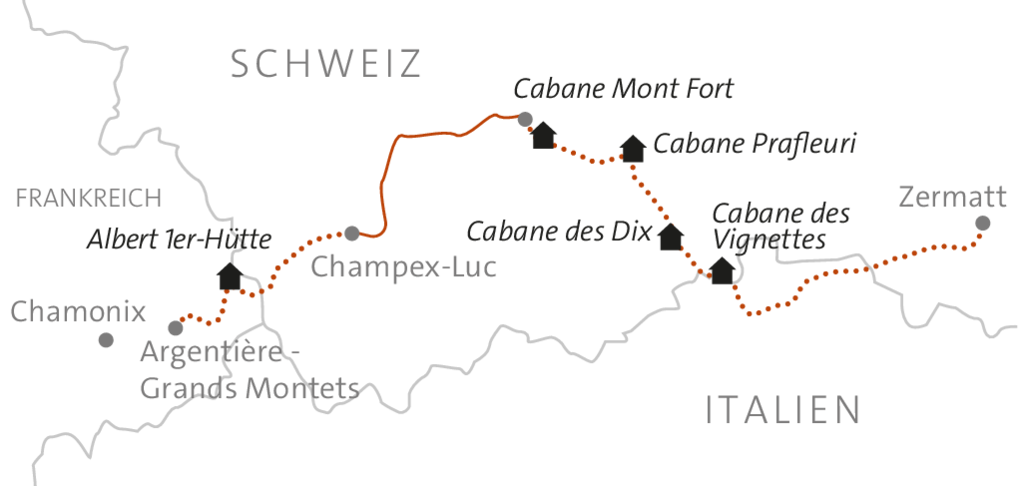 Nach einem kurzen Anstieg geht es in flachem Gelände weiter Richtung Glacier de Cheilon. Vorbei an der Tête Noire (3.022 m) erreichen wir die idyllische Cabane des Dix (2.928 m), wo wir bereits um die Mittagszeit ankommen. Am Nachmittag bleibt Zeit, die herrliche Umgebung zu erkunden – vielleicht wartet ein zusätzlicher 3000er auf uns!